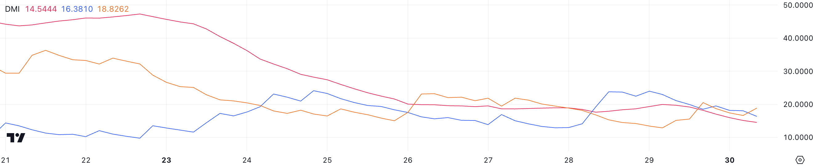 솔라나 DMI 차트는 ADX가 현재 14.5에 있으며, 하루 전 거의 20에서 하락했음을 보여줍니다. 이 하락은 추세 강도가 약해지고 있음을 반영하며, 최근 시장 모멘텀이 약화되고 있음을 나타냅니다.