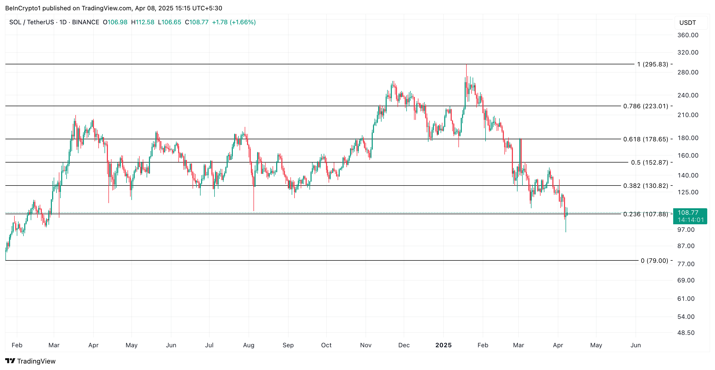 월요일의 장중 거래 세션 동안 SOL은 12개월 최저치인 95.26달러로 급락했습니다. 이후 반등하여 보도 시점에서 108.77달러에 거래되고 있지만, 지속적인 약세 편향은 코인이 이익을 잃을 위험에 처해 있습니다.