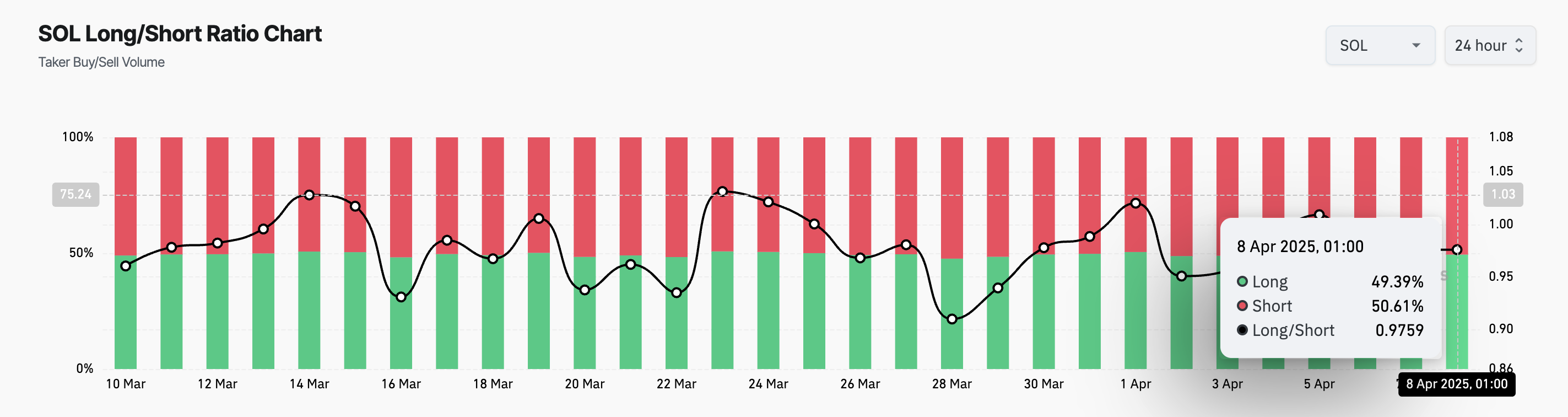 Sponsored롱/숏 비율은 시장에서 롱 포지션(가격 상승에 베팅)과 숏 포지션(가격 하락에 베팅) 간의 균형을 측정합니다. 이 비율이 0보다 낮을 때는 숏 포지션이 롱 포지션보다 많음을 나타냅니다.