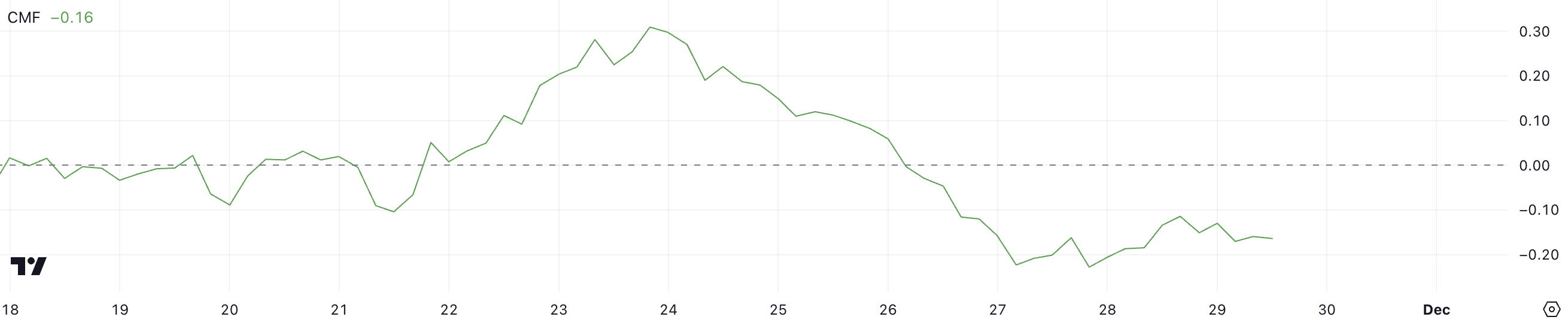 XLM의 CMF는 현재 -0.16으로, 11월 26일 이후 4일 연속 긍정적이었던 후 지속적인 부정적 추세를 나타냅니다. CMF, 즉 차이킨 머니 플로우는 주어진 기간 동안 자본 유입과 유출을 측정하며, 0 이상은 매수 압력을, 0 이하의 값은 매도 우위를 나타냅니다.