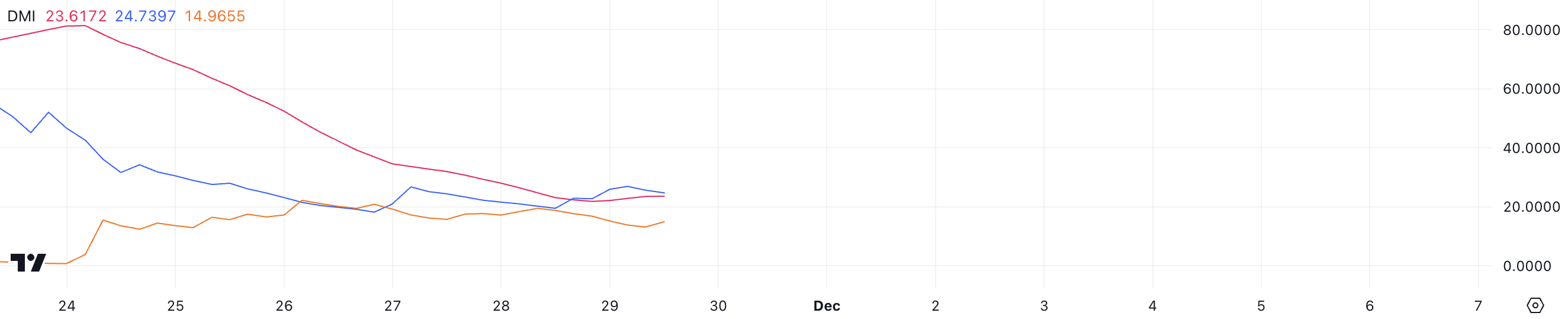 스텔라 DMI 차트는 ADX가 23.6으로, 이틀 전 40 이상에서 크게 하락했음을 나타내며, 추세 모멘텀이 약화되고 있음을 시사합니다. ADX, 즉 평균 방향성 지수는 0에서 100까지의 척도로 추세의 강도를 측정하며 방향을 나타내지 않습니다. 25 이상은 강한 추세를, 20 이하의 값은 약하거나 없는 추세를 나타냅니다.