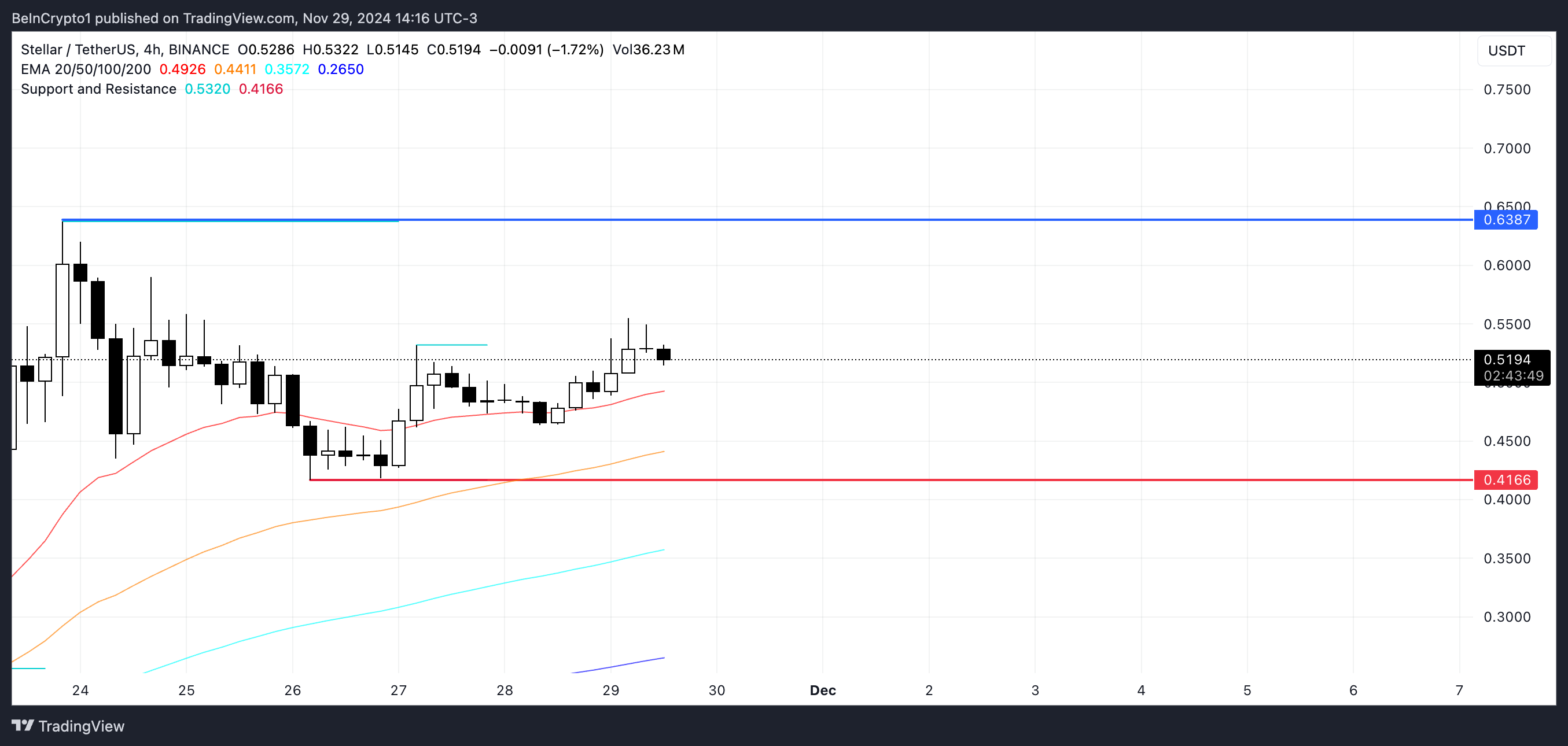 현재의 상승 추세가 강해지면, XLM 가격은 이 저항 수준을 다시 테스트하고 잠재적으로 0.70달러까지 상승할 수 있으며, 이는 현재 수준에서 37% 증가를 나타냅니다.