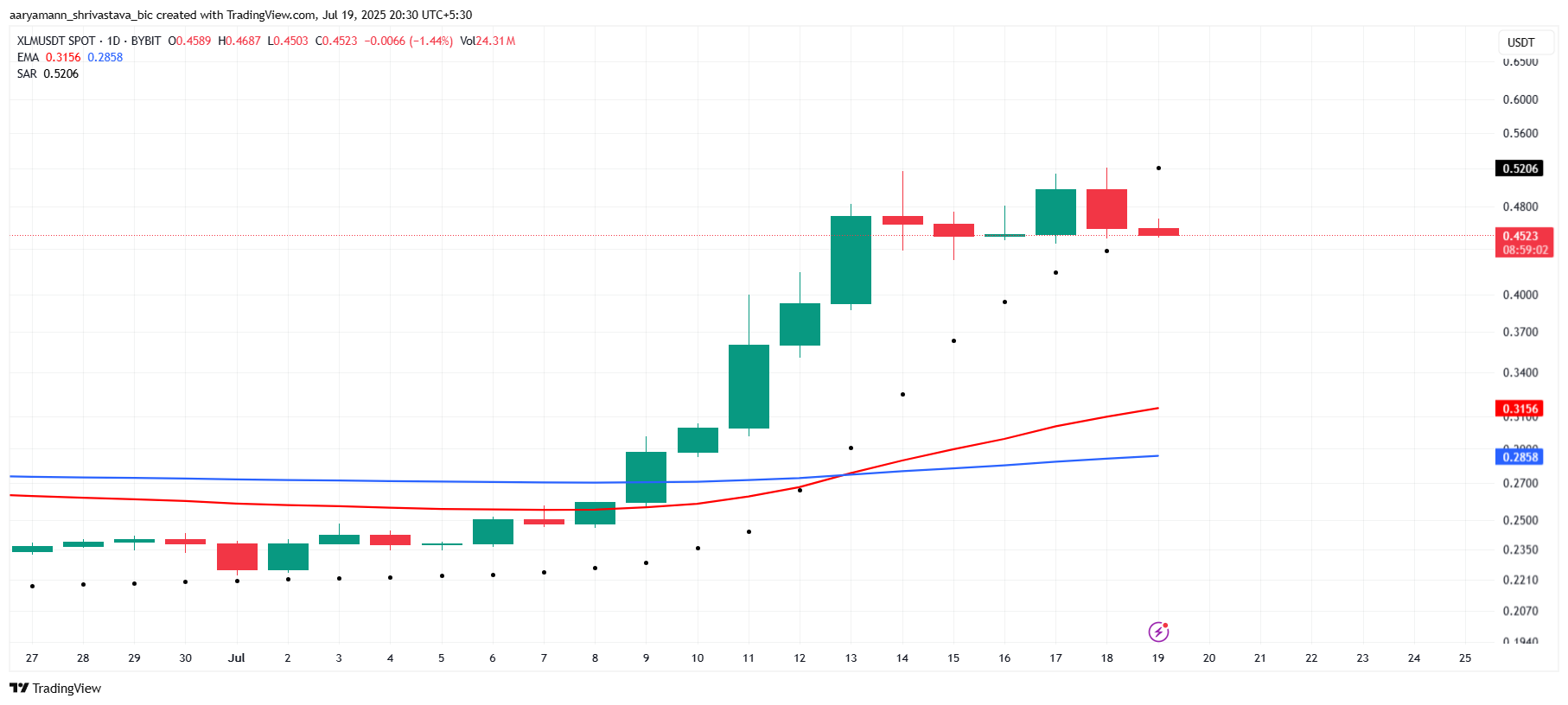 캔들스틱 위에 위치한 파라볼릭 SAR은 XLM의 하락세가 강해지고 있음을 나타냅니다. 이 기술적 신호는 하락 모멘텀이 잡히고 있어 알트코인이 0.50달러 저항을 넘기 어렵다는 것을 시사합니다.