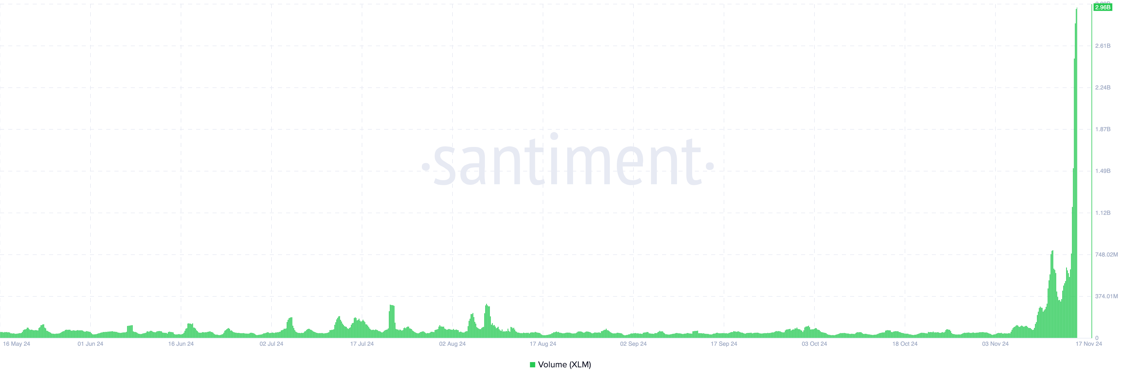 센티멘트의 데이터에 따르면, XLM의 거래량은 현재 29억6000만 달러에 이르렀습니다. 이 거래량의 증가는 알트코인에 대한 구매 압력이 증가하고 시장 관심이 눈에 띄게 증가하고 있음을 분명히 보여줍니다.
