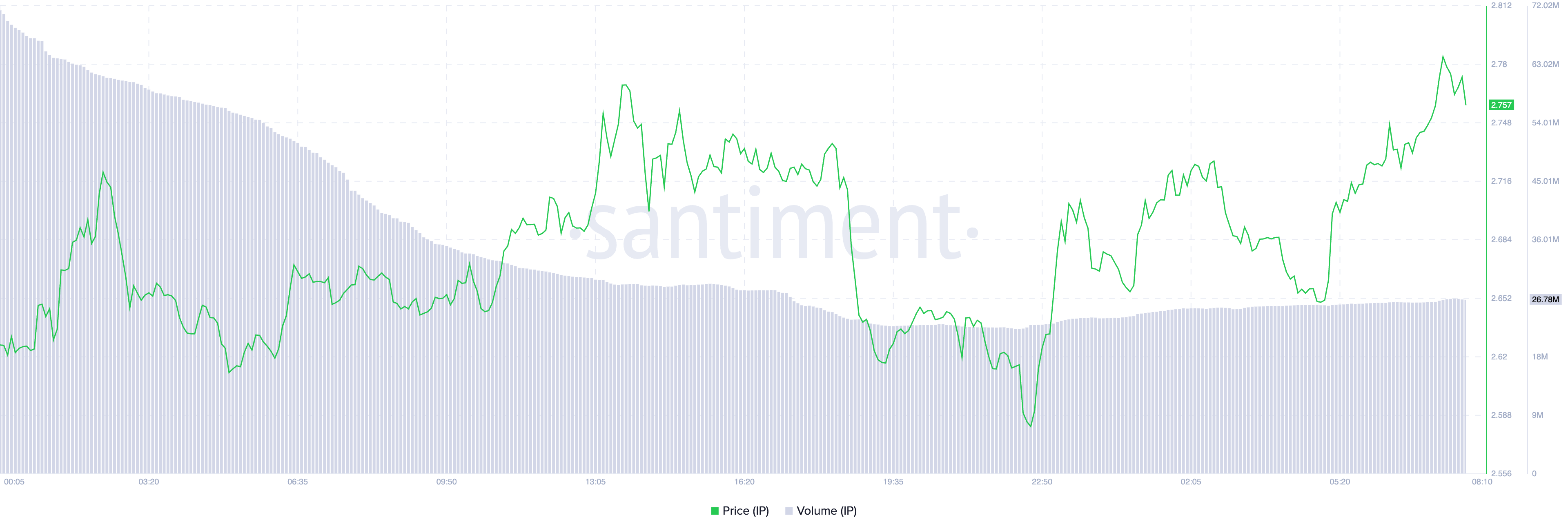 예를 들어, 지난 하루 동안 4% 상승하는 동안, IP의 일일 거래량은 38% 감소하여, 상승하는 가격 움직임을 지지하는 참가자가 적음을 나타냅니다.