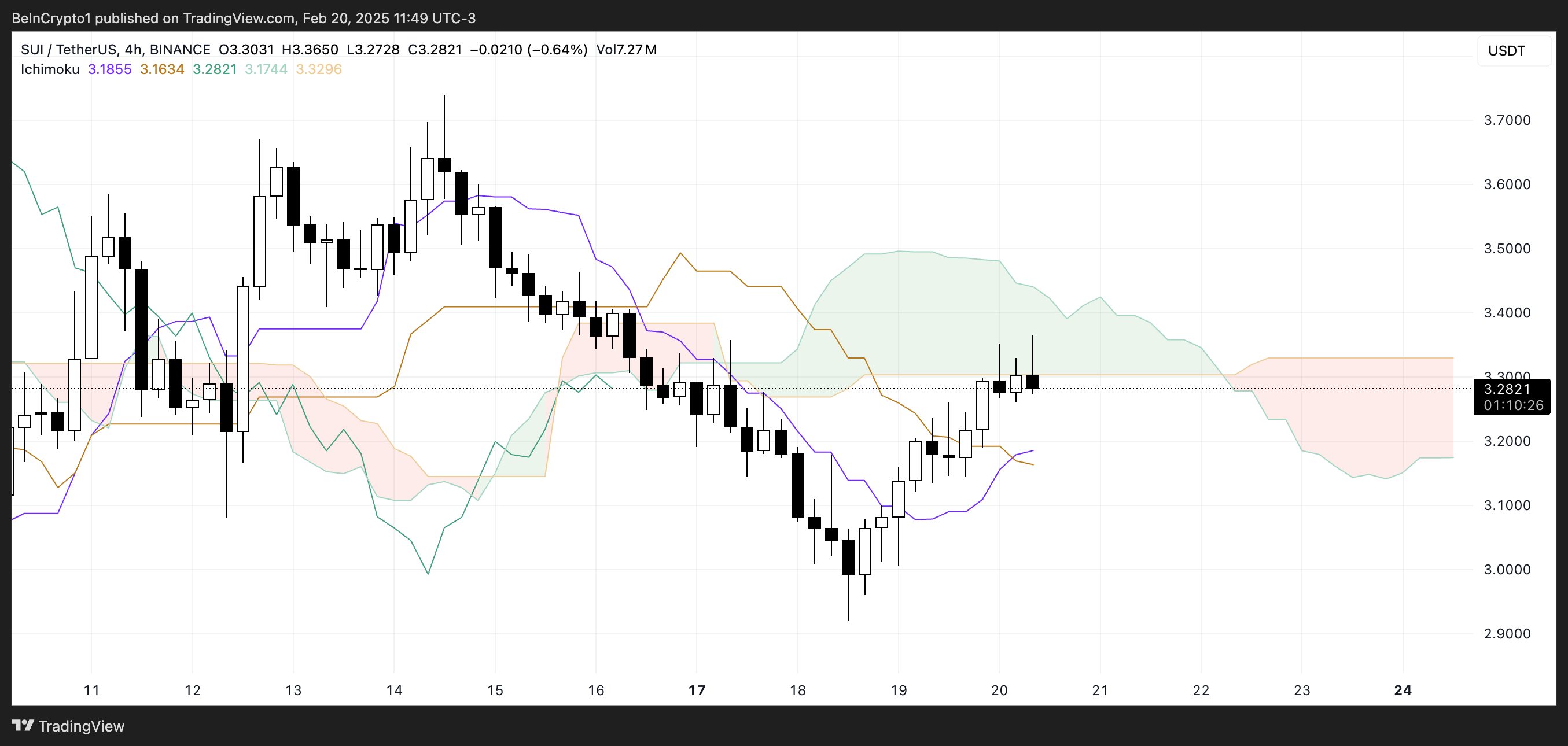 SUI의 일목균형표는 잠재적인 조정 신호와 함께 혼합된 전망을 보여줍니다. 현재 구름의 선행 스팬 A(녹색 선)가 선행 스팬 B(주황색 선) 위에 있어 가까운 미래에 대한 강세 심리를 나타냅니다.
