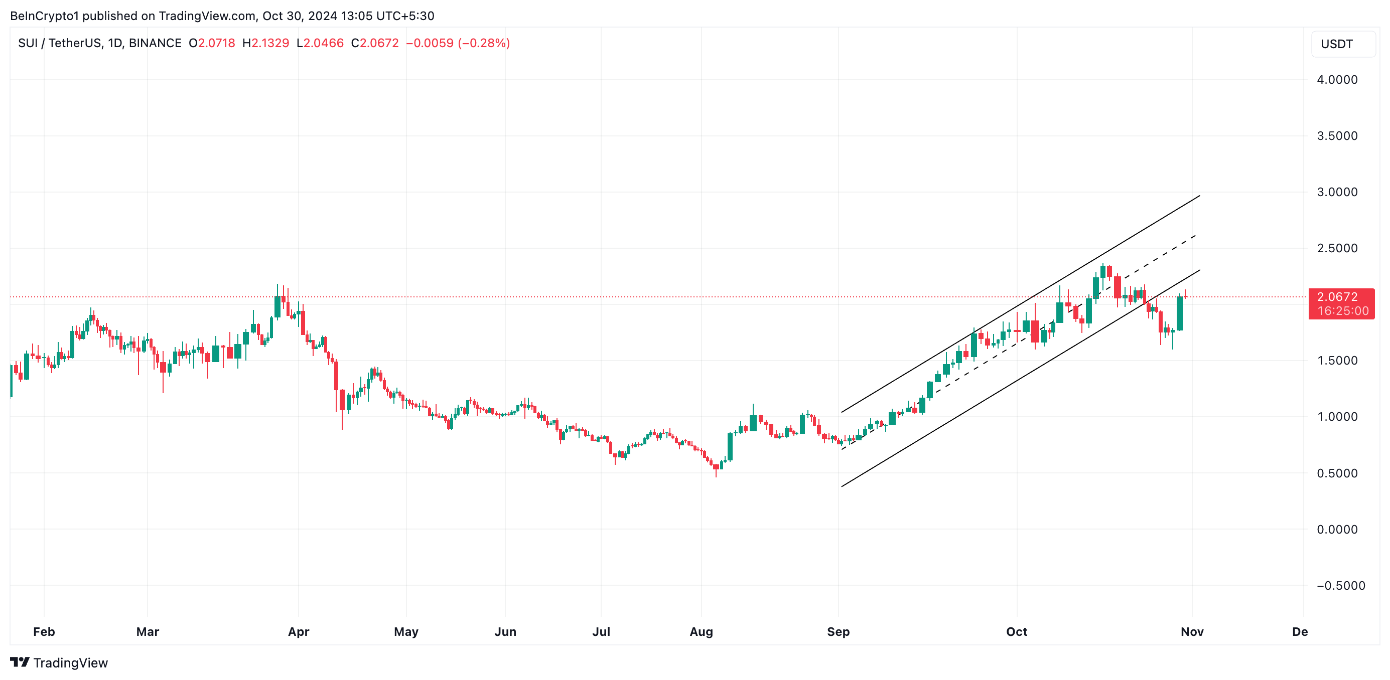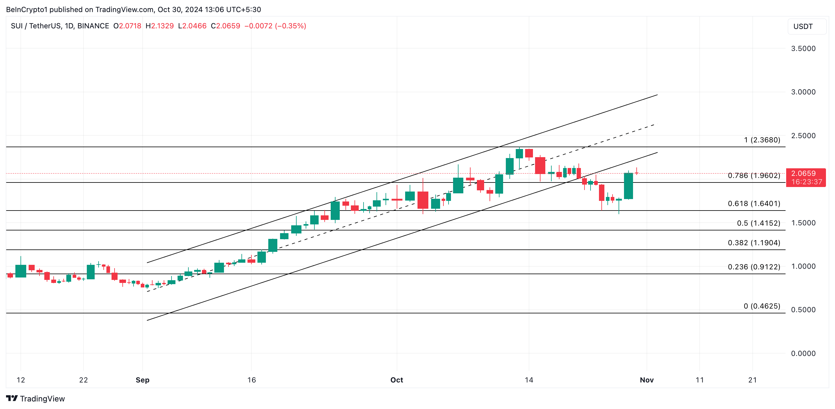 BeInCrypto의 SUI/USD 1일 차트 분석에 따르면, 이 알트코인은 10월 22일에 하락한 상승 평행 패턴으로 다시 진입하려고 시도하고 있습니다. 이 채널은 자산 가격이 두 개의 평행한 추세선 사이에서 상승하며 형성되는 강세 패턴입니다.