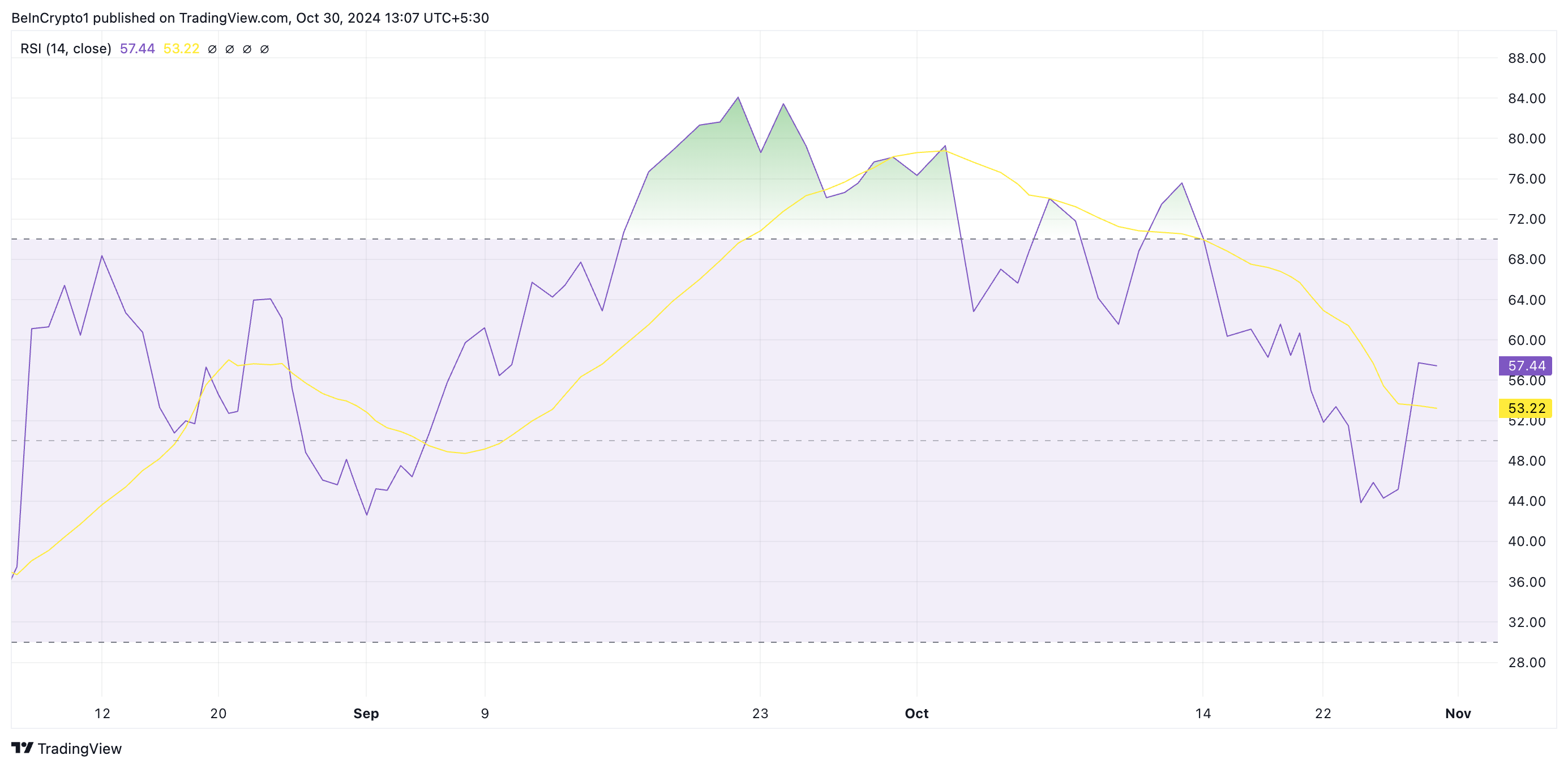 SponsoredSUI의 상승하는 상대 강도 지수(RSI)는 수요의 부활을 확인합니다. 현재 57.44로 상승 추세에 있으며, 이 지표는 매수 동력이 판매 활동보다 우세함을 나타냅니다.