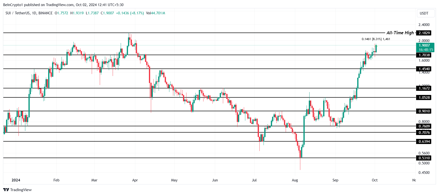 SUI는 지난 24시간 동안 8% 상승했습니다, 현재 가격은 1.90달러입니다. 다음 저항 수준은 2.18달러로, 현재 가격에서 15% 떨어져 있습니다. 현재의 모멘텀을 고려할 때 SUI는 가까운 장래에 이를 달성할 것으로 보이며, 이는 9월부터 시작된 151%의 상승세를 이어갈 것입니다.