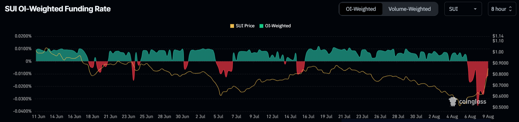 약세 정서에 더해, SUI의 마이너스 펀딩 비율은 비관적인 전망을 더욱 뒷받침합니다. 일반적으로 펀딩 비율이 마이너스라는 것은 더 많은 트레이더가 해당 자산에 베팅하고 있음을 의미하며, 이는 가격 하락 압력에 기여하고 약세 추세를 강화할 수 있습니다.