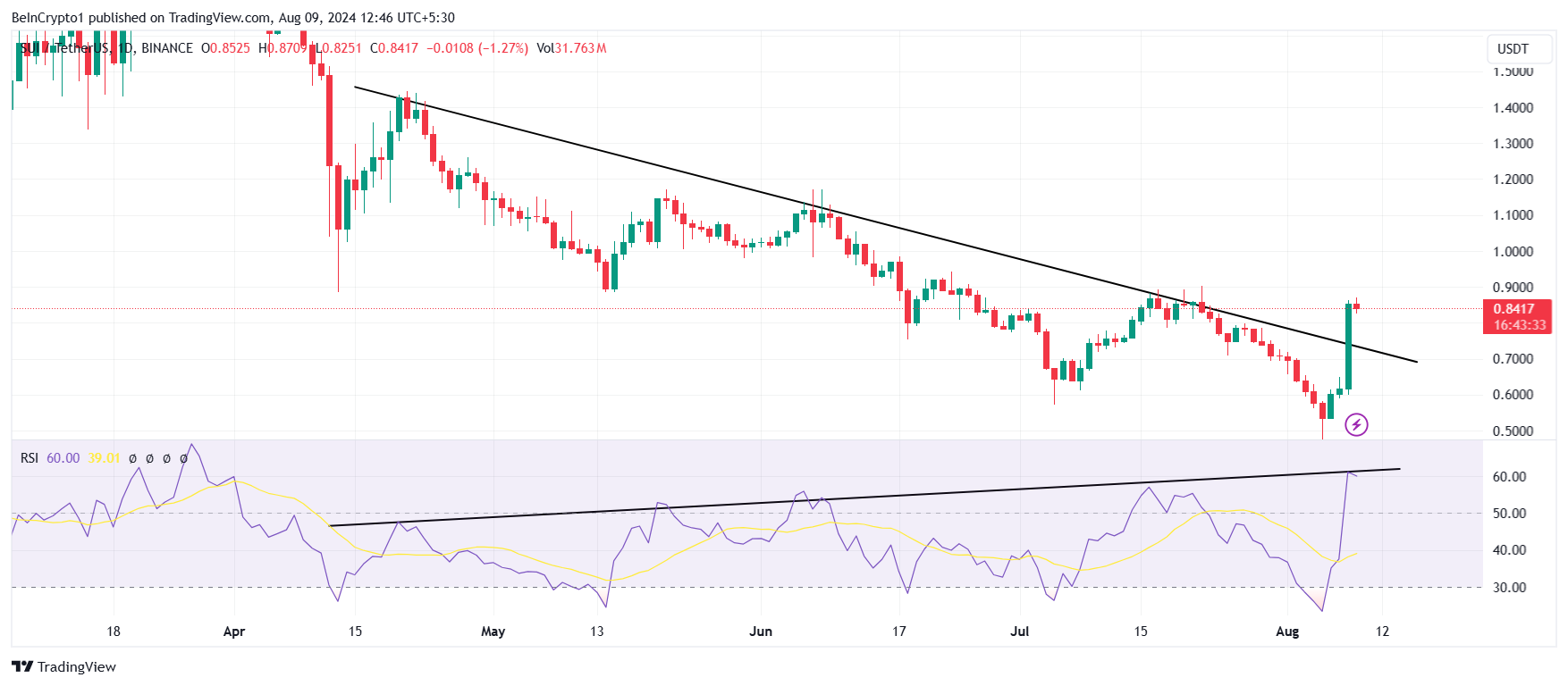 SUI 가격 상승으로 인해 알트코인은 거의 4개월 동안의 하락 추세를 돌파했습니다. 흥미롭게도 이 하락 추세선은 상대 강도 지수(RSI)와 함께 현재 숨겨진 연속 다이버전스를 형성하고 있습니다.