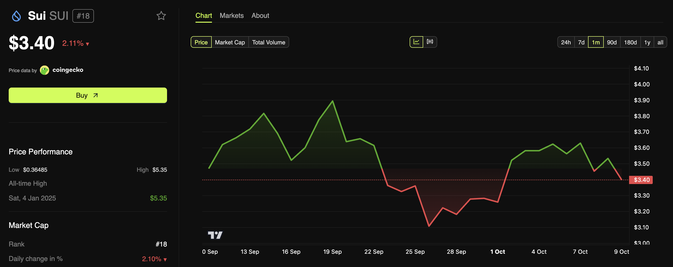 Sui 네트워크의 급등에도 불구하고, 그 토큰은 여전히 뒤처져 있습니다. BeInCrypto Markets 데이터에 따르면 SUI의 가격은 지난달 동안 5.7% 하락했습니다.