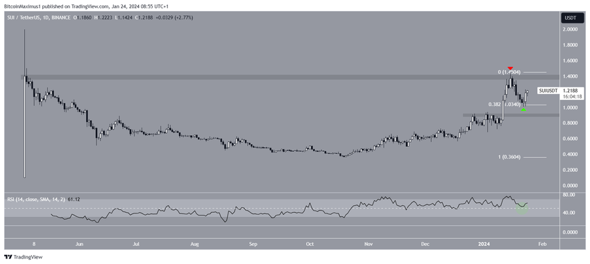 1월 15일 (빨간색 아이콘) 최고가인 1.45달러(빨간색 아이콘) 이후 SUI 가격이 하락했습니다. 이는 5월의 사상 최고가보다 약간 낮은 가격입니다. 계속된 하락으로 1월 22일에는 1달러로 최저치를 기록했습니다.