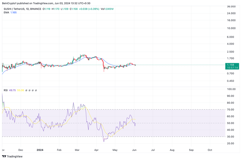 SUSHI는 6월 2일 거래 세션에서 1.11달러로 바닥을 찍은 이후 5% 급등했습니다. 이 글을 쓰는 현재 SUSHI는 1.16달러에 거래되고 있습니다.