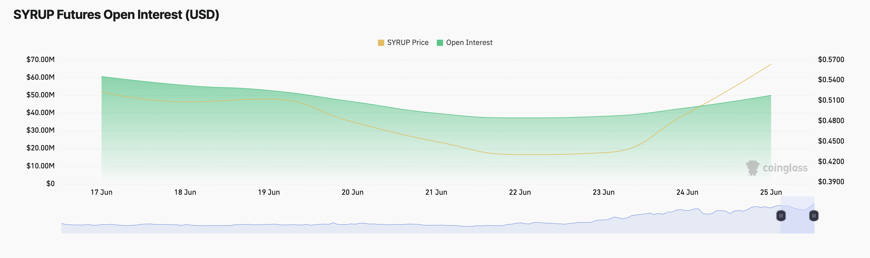 SYRUP의 경우, 미결제 약정의 증가와 가격 상승은 강세 움직임이 계속될 것이라는 트레이더들의 확신이 커지고 있음을 시사합니다.