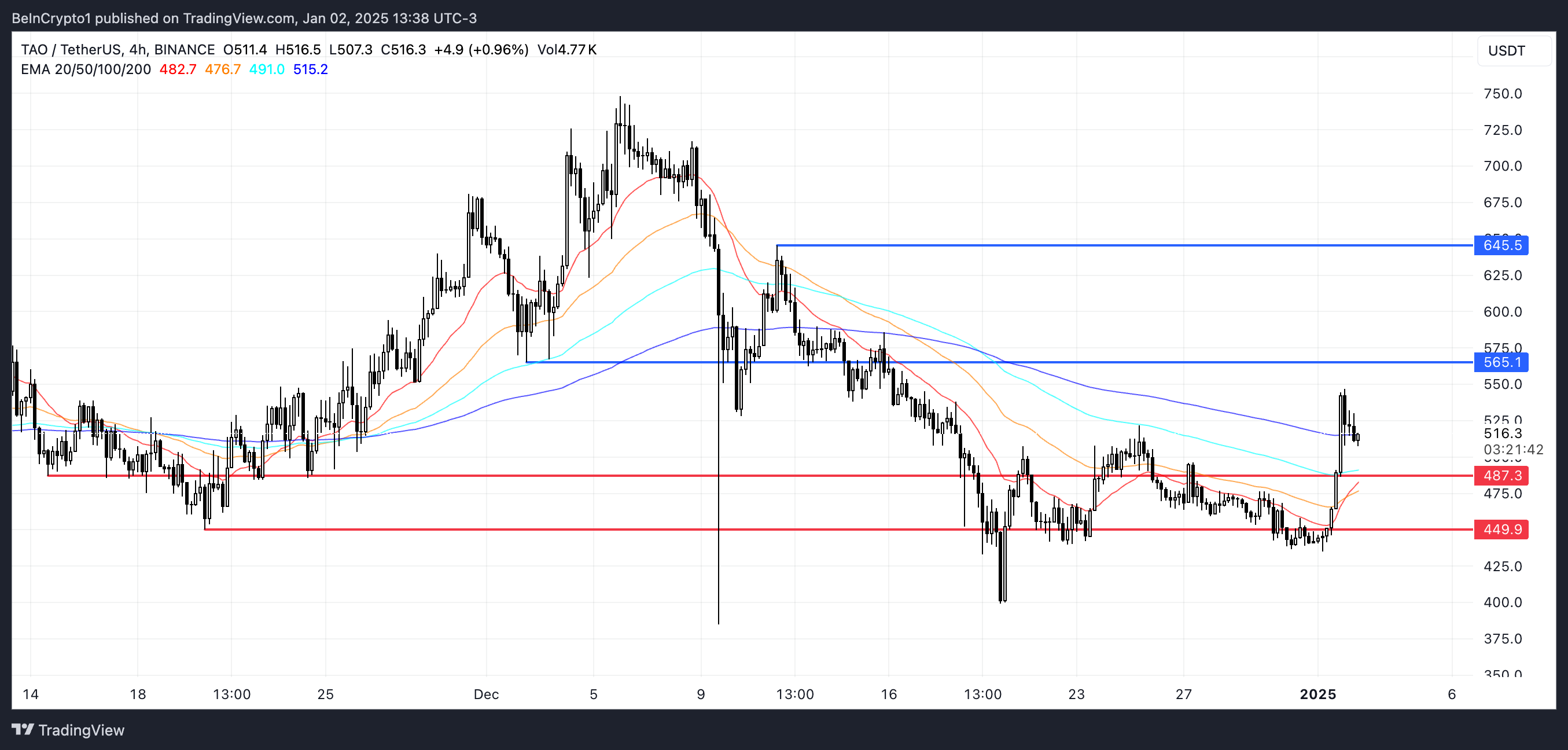 반면, 상승세가 모멘텀을 잃고 유지되지 않으면 TAO 가격은 조정을 겪을 수 있습니다. 이 경우, 가격은 먼저 487달러의 지지를 테스트할 수 있습니다. 이 수준 아래로의 돌파는 더 큰 하락으로 이어질 수 있습니다. 이는 TAO 가격을 449달러로 낮추어 잠재적으로 12.9%의 조정을 나타냅니다.