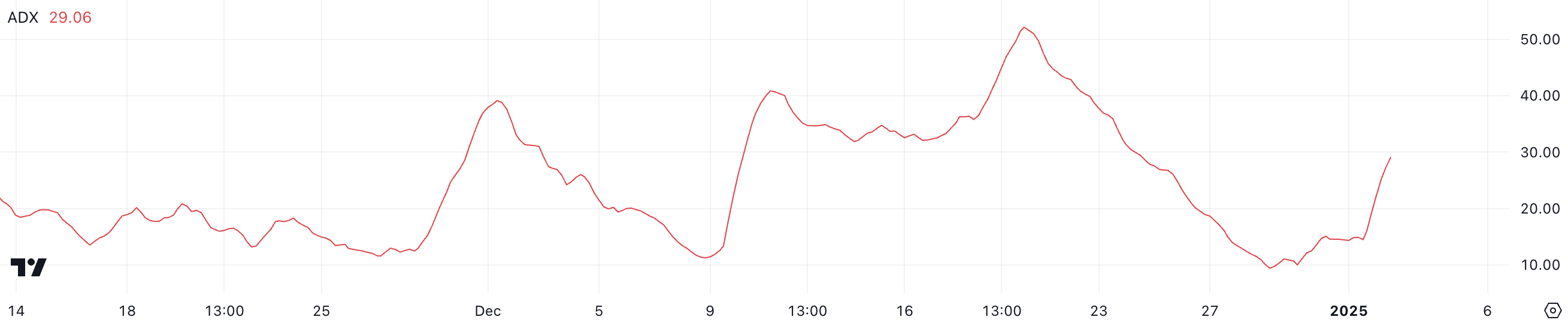 ADX는 0에서 100까지의 척도로 추세의 강도를 측정합니다. 25 이상은 강한 추세를, 20 미만은 약하거나 없는 추세 모멘텀을 나타냅니다.