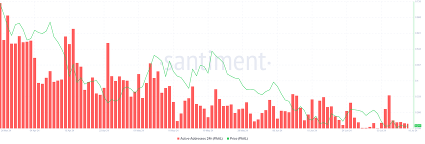 PAAL 가격은 추가 조정을 앞두고 있습니다. PAAL AI 활성 주소의 지속적인 감소는 참여가 부족하다는 신호입니다. 이러한 추세는 사용자층의 참여가 줄어들고 있음을 나타내며, 알트코인의 향후 성과에 대한 우려를 불러일으킵니다.