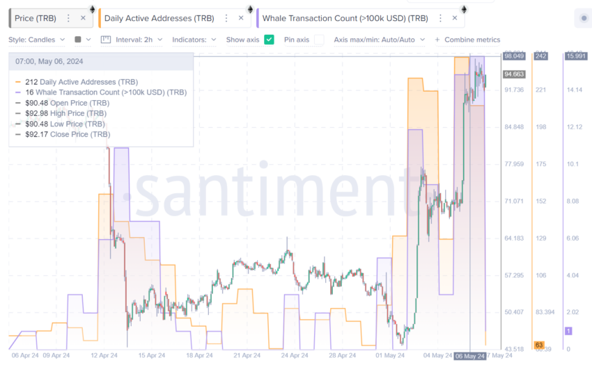 블록체인 분석 플랫폼 Santiment의 데이터에 따르면 암호화폐 고래의 거래와 TRB와 관련된 활성 주소가 급증한 것으로 나타났습니다. 특히 5월 6일에는 일일 활성 주소가 212개, 10만 달러를 초과한 고래 거래가 총 16개에 달했습니다.