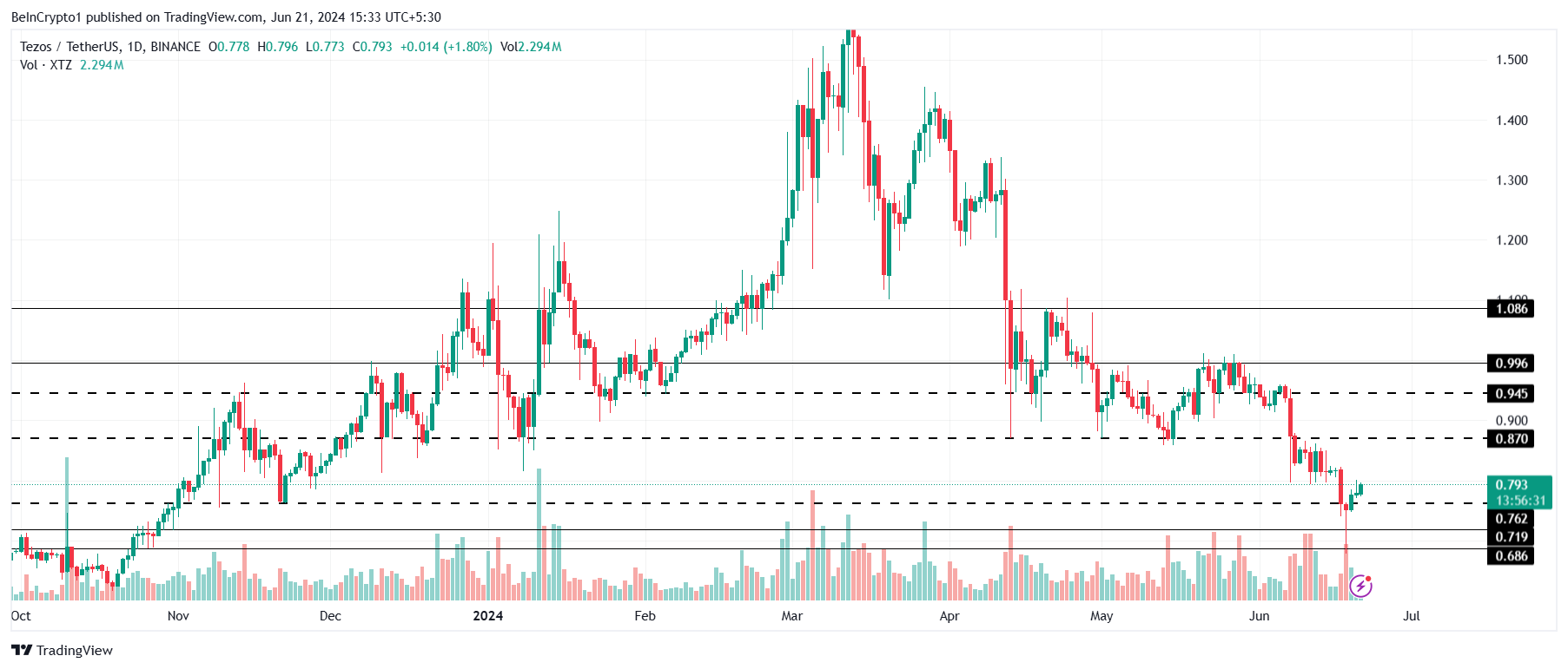 XTZ 가격은 현재 7개월래 최저치인 0.79달러로 0.76달러에서 반등했습니다. 알트코인은 이번 주 동안 $0.70 아래로 떨어지며 $0.68에 도달했습니다. 알트코인이 반등했지만 조만간 랠리를 보지 못할 수도 있습니다.