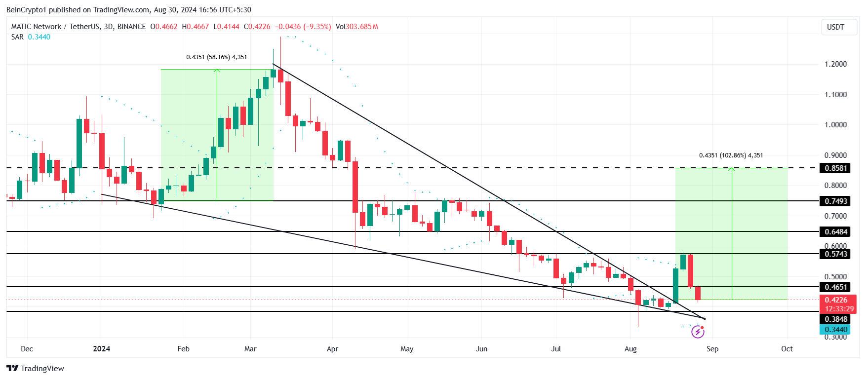 둘째, MATIC의 가격은 거의 7개월 동안의 하락 웨지에서 벗어나고 있습니다. 이 상승 패턴은 이미 발생한 돌파 이후 $0.85까지 103% 상승을 예측합니다.