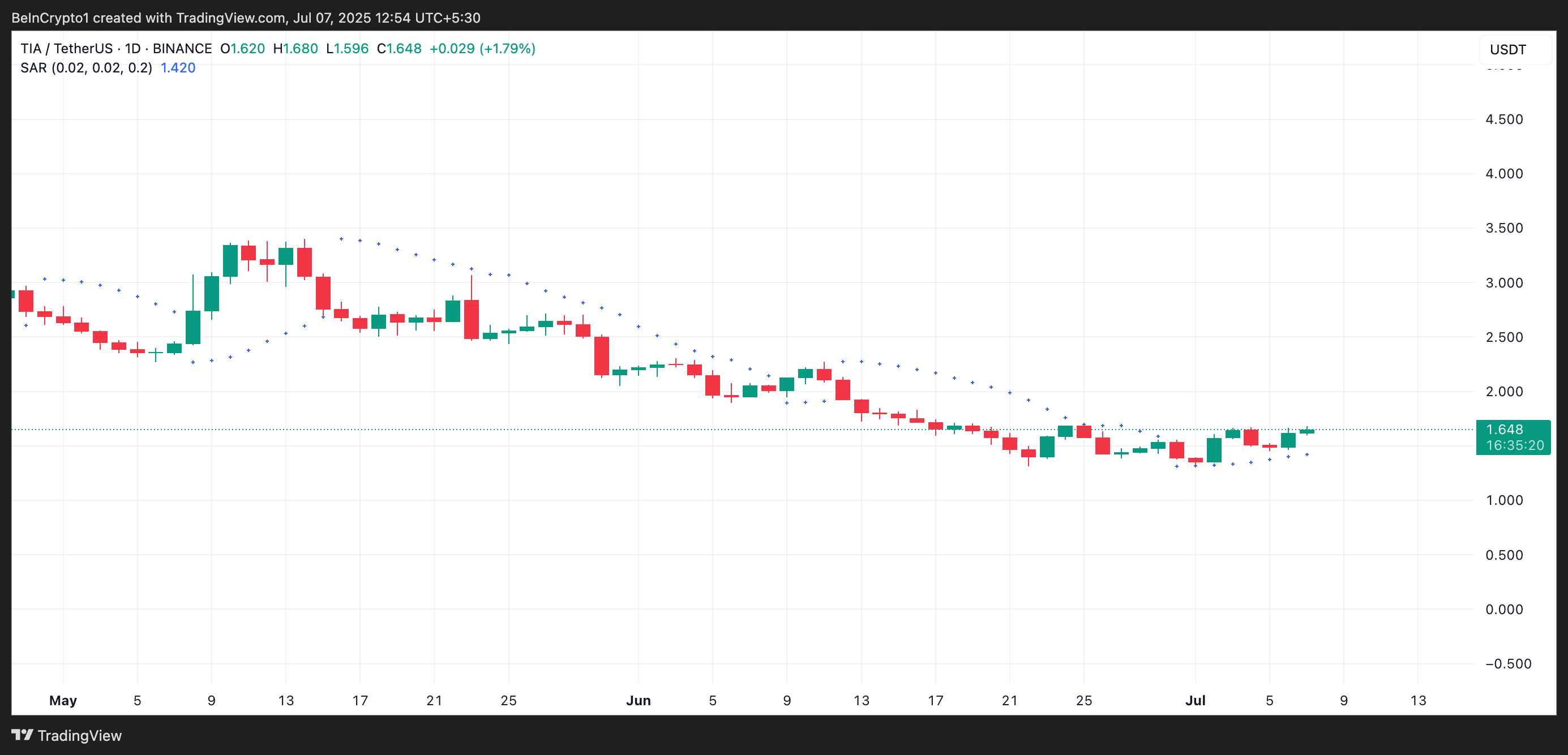또한, TIA의 파라볼릭 스탑 앤 리버스(SAR) 지표의 판독값은 현재 코인의 가격 수준 아래에 동적 지지를 형성했음을 보여줍니다. TIA가 1.64달러에 거래되는 동안, 이 지표는 1.42달러에 가격 지지대를 형성하여 구매자들의 지속적인 관심을 나타냅니다.