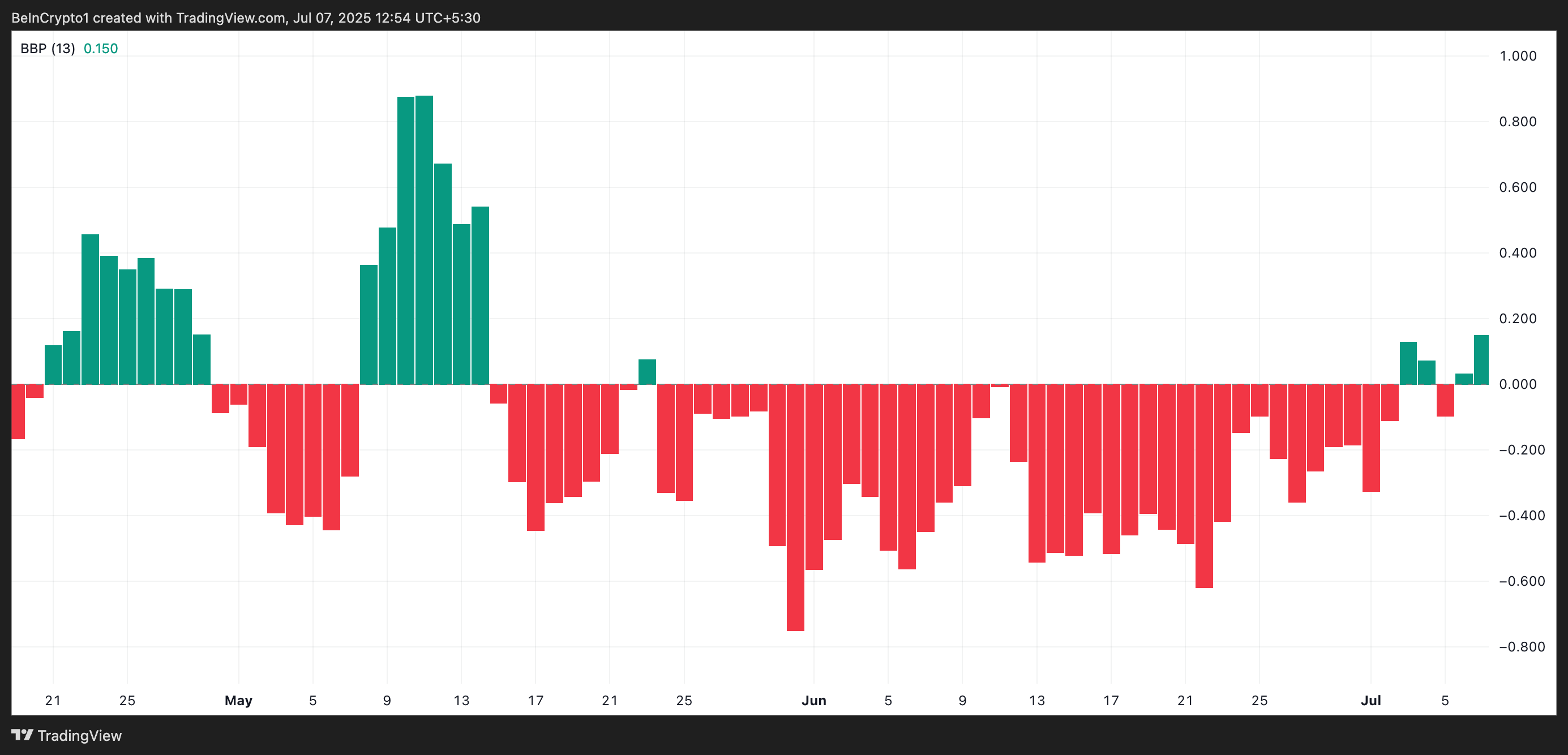 엘더-레이 지수는 현재 가격을 지수 이동 평균(EMA)과 비교하여 구매자와 판매자의 강도를 측정합니다. 값이 양수일 때, 매수자들이 시장을 지배하며 자산 가격에 상승 압력이 가해집니다.
