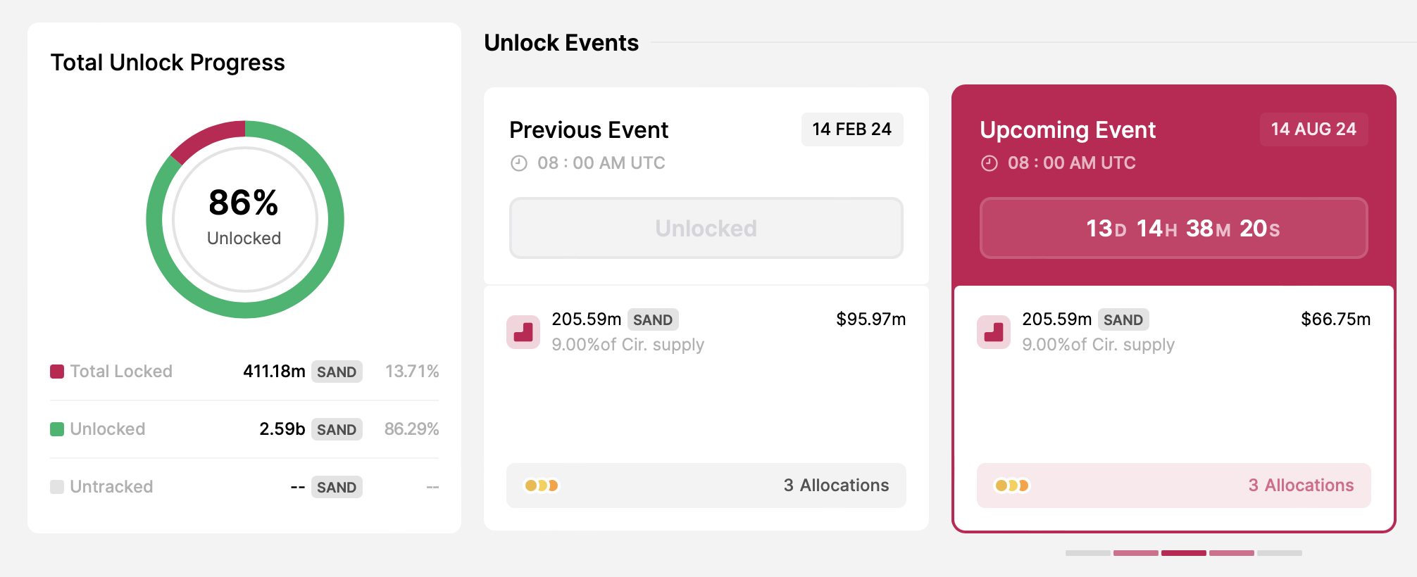 샌드박스는 매년 2월과 8월, 두 차례에 걸쳐 토큰 언락을 실시합니다. 2024년 두 번째 언락은 2024년 8월 14일로 예정되어 있습니다. 이 프로젝트는 유통량의 9%에 해당하는 2억2559만 개의 샌드 토큰을 언락할 예정입니다.