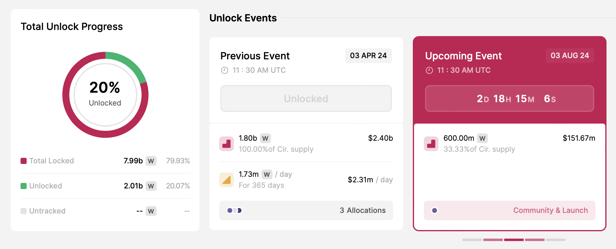 두 번째로 큰 규모의 토큰 언락은 8월 3일에 진행되며, 웜홀은 유통량의 33.33%에 해당하는 6억 개의 토큰을 출시할 예정입니다. 개발팀은 약 1억5167만 달러에 달하는 이 코인을 커뮤니티와 출시를 위해 할당했습니다.