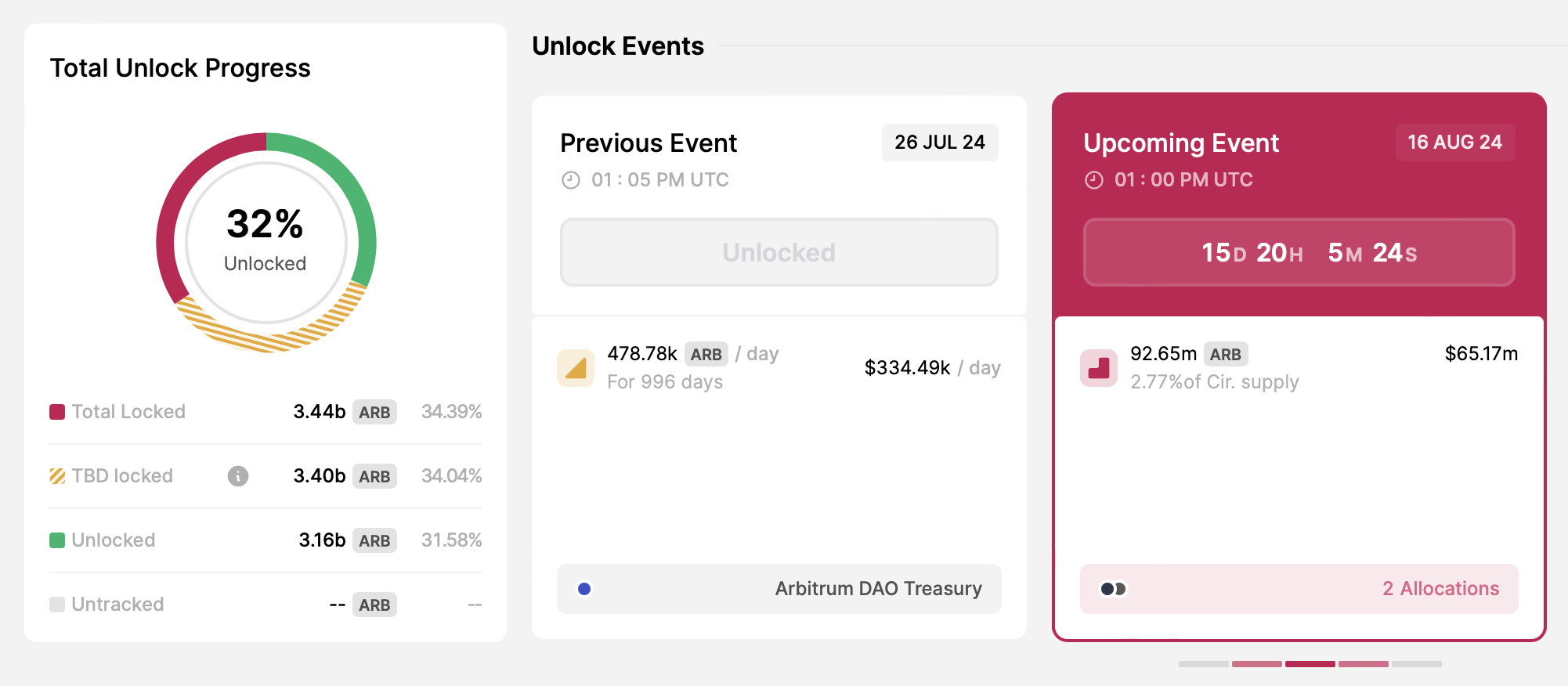 이더리움 레이어 2 아비트럼의 네이티브 토큰인 ARB는 8월 16일에 약 6517만 달러 상당의 토큰 9265만개를 출시할 예정입니다. 이번 언락은 전체 유통 공급량의 2.77%에 해당합니다. 릴리스는 다음과 같이 둘로 나뉘어 진행됩니다.