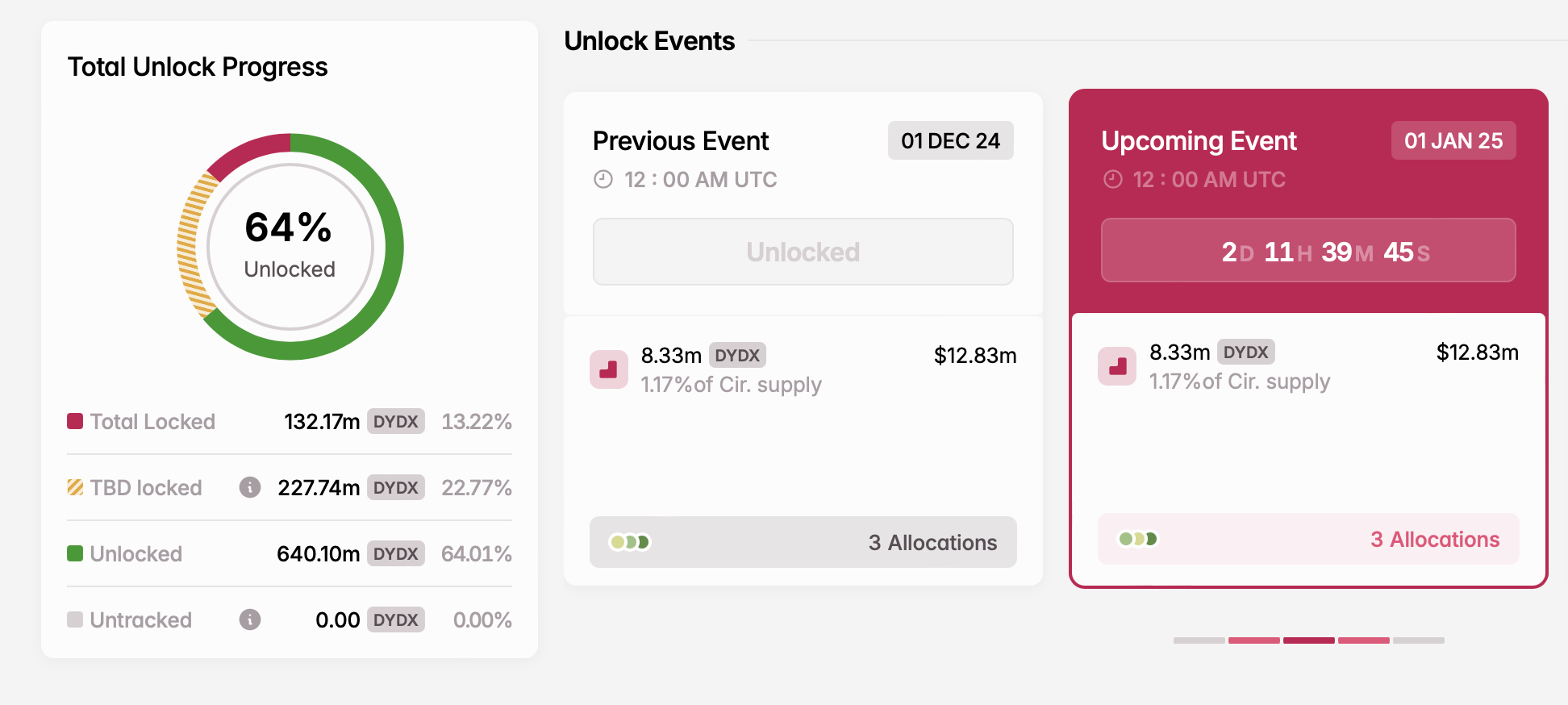 1월 1일에 언락된 대부분의 DYDX는 창립자와 투자자에게 배분되며, 나머지 토큰은 현재 및 미래의 직원에게 예약됩니다.