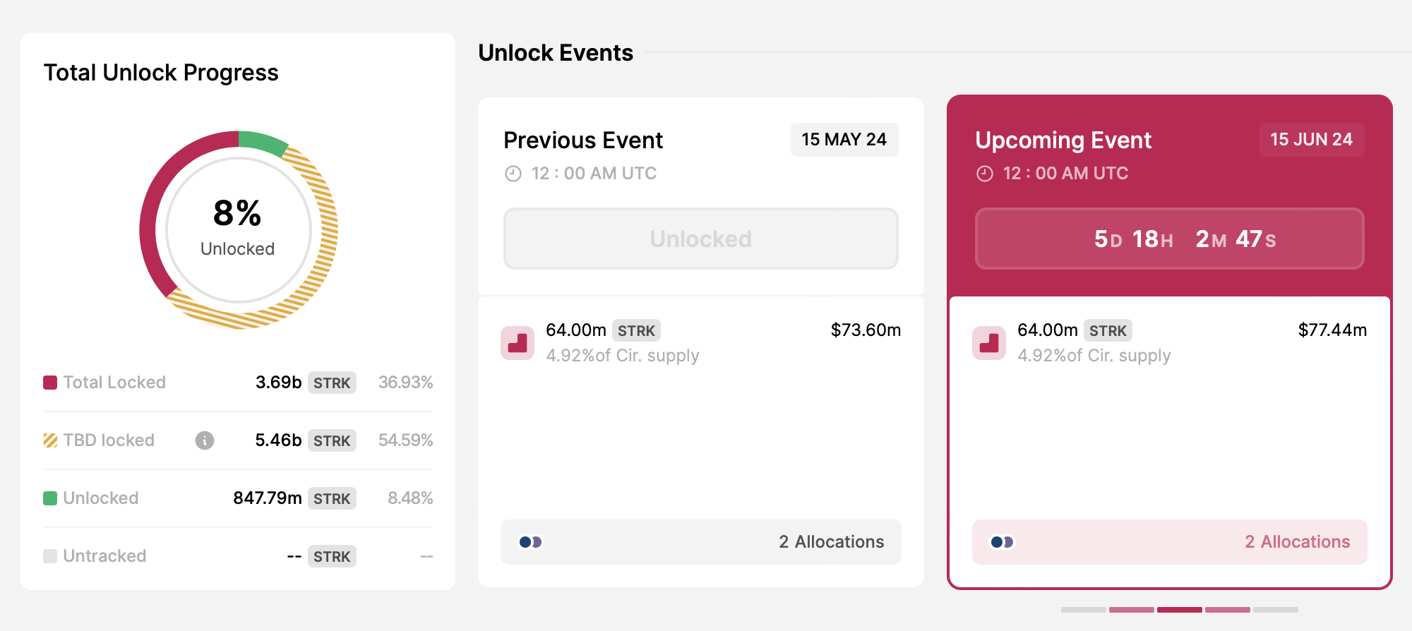 6월 15일, 이 프로젝트는 6,400만 개의 STRK 토큰을 언락하여 투자자와 초기 기여자에게 배포할 예정입니다.