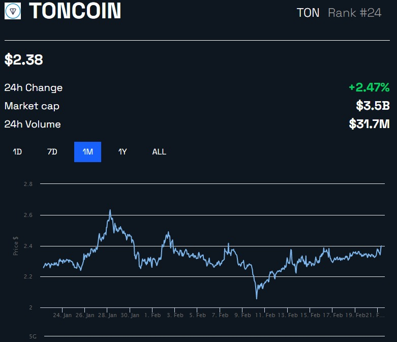 톤코인은 이날 2.47% 소폭 상승해 보도 시점에 2.38달러에 거래되고 있다. 그러나 지난 한 달 동안 TON 가격에는 거의 변동이 없었다.