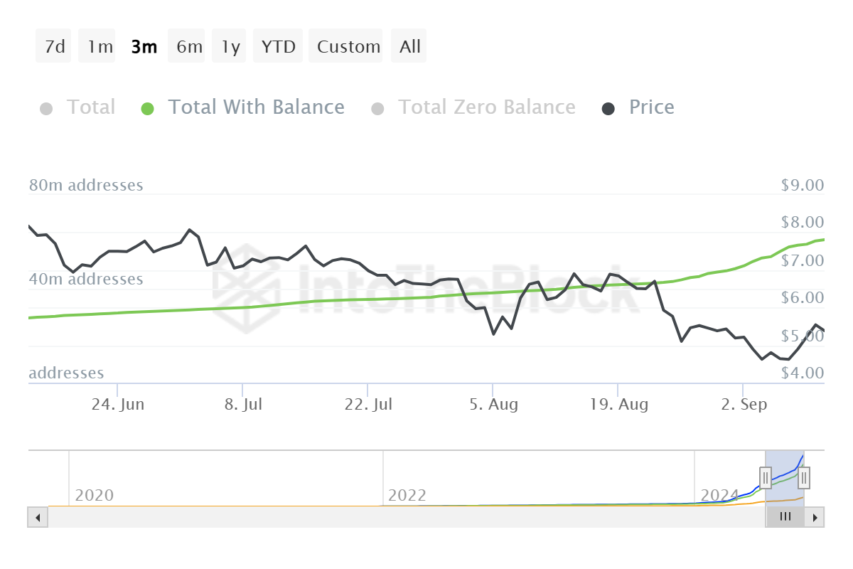 첫째, 톤코인에 대한 전반적인 인식이 긍정적으로 변하고 있습니다. 이는 잔액을 보유한 주소 수의 급격한 증가로 나타났습니다. 9월 초부터 주소 수는 64% 증가하여 3713만에서 6092만으로 상승했습니다. 이는 8월 동안 3084만에서 3713만으로 20% 증가한 것과 대조적입니다.