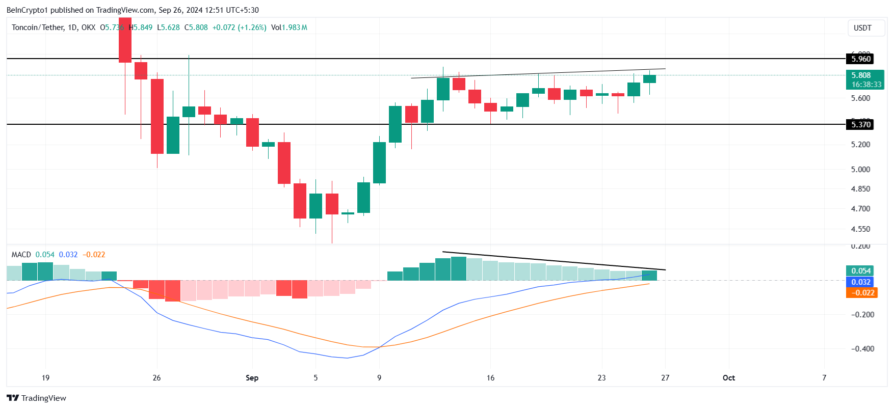 거시적 모멘텀을 살펴보면, 기술적 지표는 톤코인의 잠재적 하락을 시사합니다. 이동 평균 수렴 발산(MACD)은 더블 탑 발산에 근접하고 있으며, 이는 종종 반전을 예고하는 신호입니다. 이 패턴과 가격의 상승 고점 형성은 곧 강세 모멘텀이 정점에 도달할 수 있음을 시사합니다.