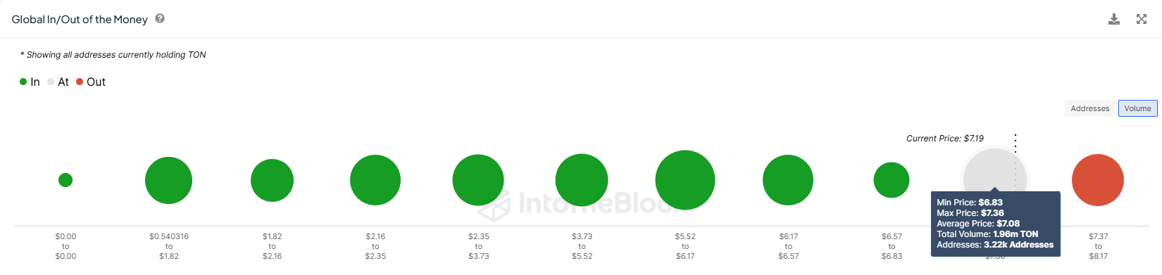 톤코인의 가격은 최근 사상 최고치를 기록했지만 곧 7.0달러 아래로 떨어졌습니다. 이러한 하락으로 인해 많은 투자자가 최근 랠리 기간 동안 쌓은 수익을 잃었습니다. 글로벌 인/아웃 오브 더 머니(GIOM) 지표에 따르면 약 200만 톤이 수익을 내기 직전에 있습니다.