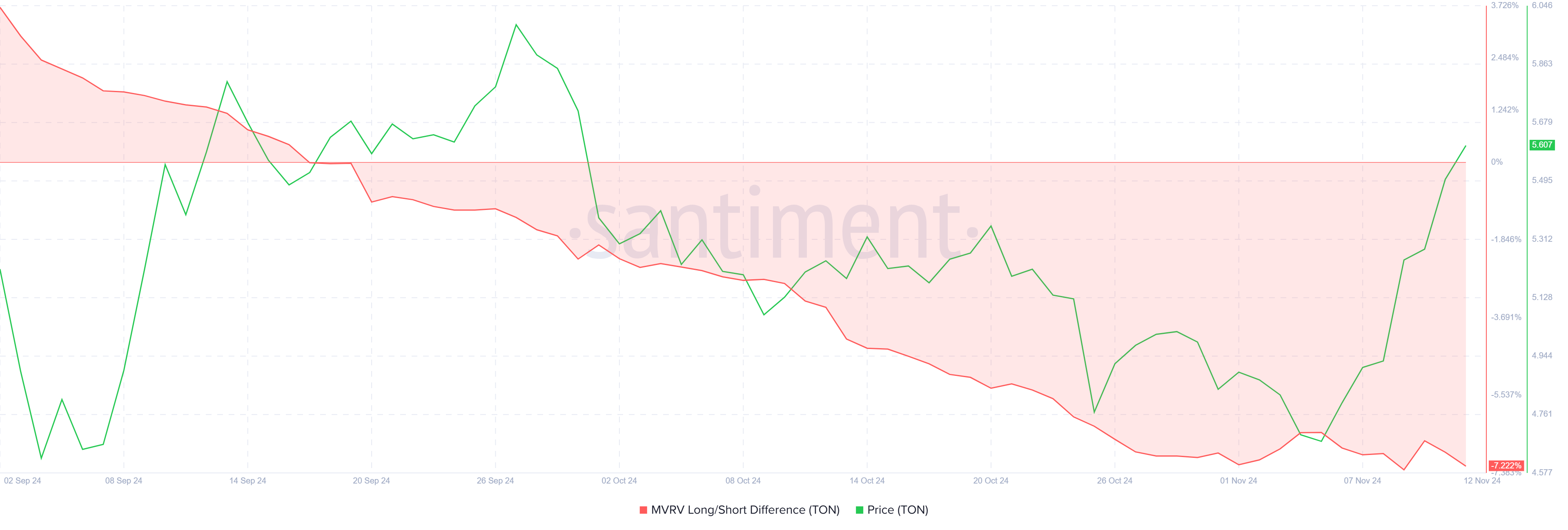 현재 MVRV 장단기 차이 지표는 톤코인에 대한 잠재적인 혼란을 예고하고 있습니다. 이 지표는 더욱 부정적인 영역으로 떨어져 단기 보유자들이 이익을 보고 있다는 것을 시사합니다.