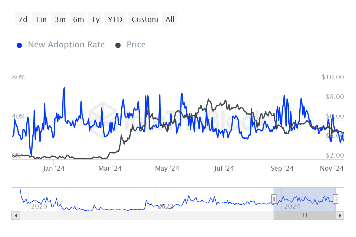 톤코인의 채택률은 활성 주소 중 처음으로 거래를 진행하는 비율을 측정하는데, 이 비율은 현재 18.64%로 2023년 12월 이후 최저치를 기록하고 있습니다. 이는 신규 투자자의 관심 부족을 시사하며, 신규 사용자가 TON에 투자할 이유를 찾지 못하고 있어 자본과 참여를 유치하는 데 어려움을 겪고 있습니다.