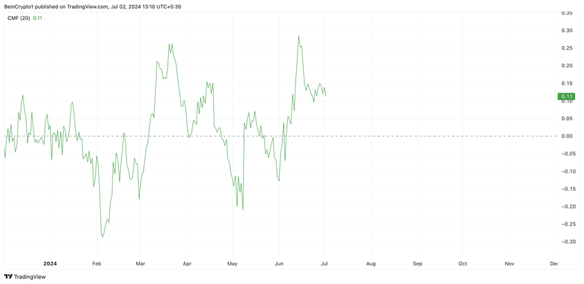 지난달 TON의 가격 상승에도 불구하고 차이킨 자금 흐름(CMF)은 6월 15일 이후 하락 추세를 보이고 있습니다.