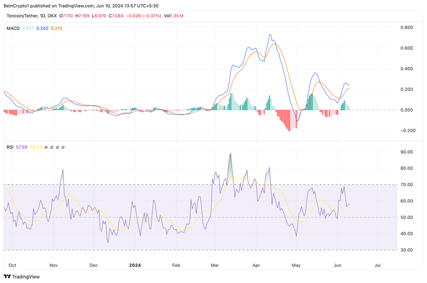 알트코인의 이동평균 수렴/발산(MACD) 지표의 수치는 이러한 가능성을 암시합니다. 보도 시점에 TON의 MACD 선(파란색)은 신호선(주황색) 아래로 교차하도록 설정되어 있습니다.
