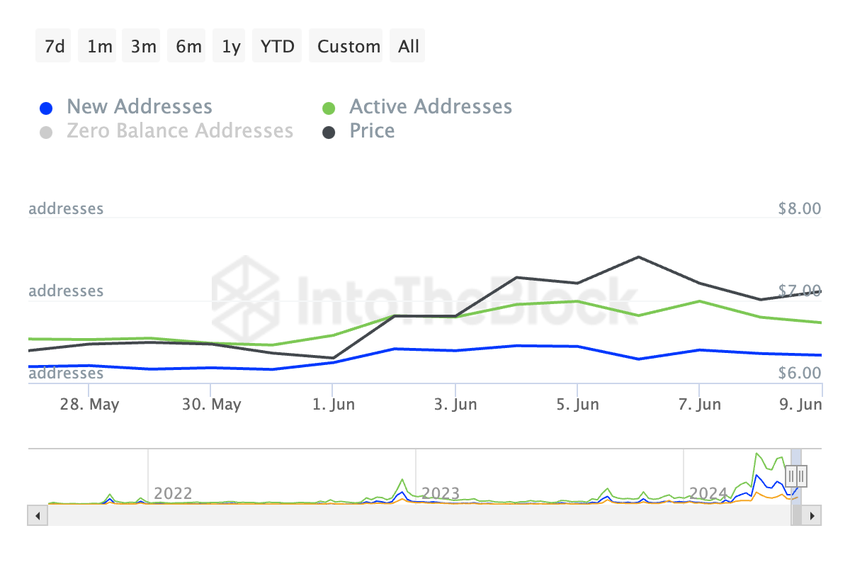 톤코인(TON)이 연중 최고치를 기록한 이후 7%의 가격 하락은 지난주 매수 모멘텀이 감소했기 때문입니다. 이는 지난 한 주 동안 TON의 일일 활성 주소 수와 신규 주소 수에서 감소한 것으로 확인되었습니다.