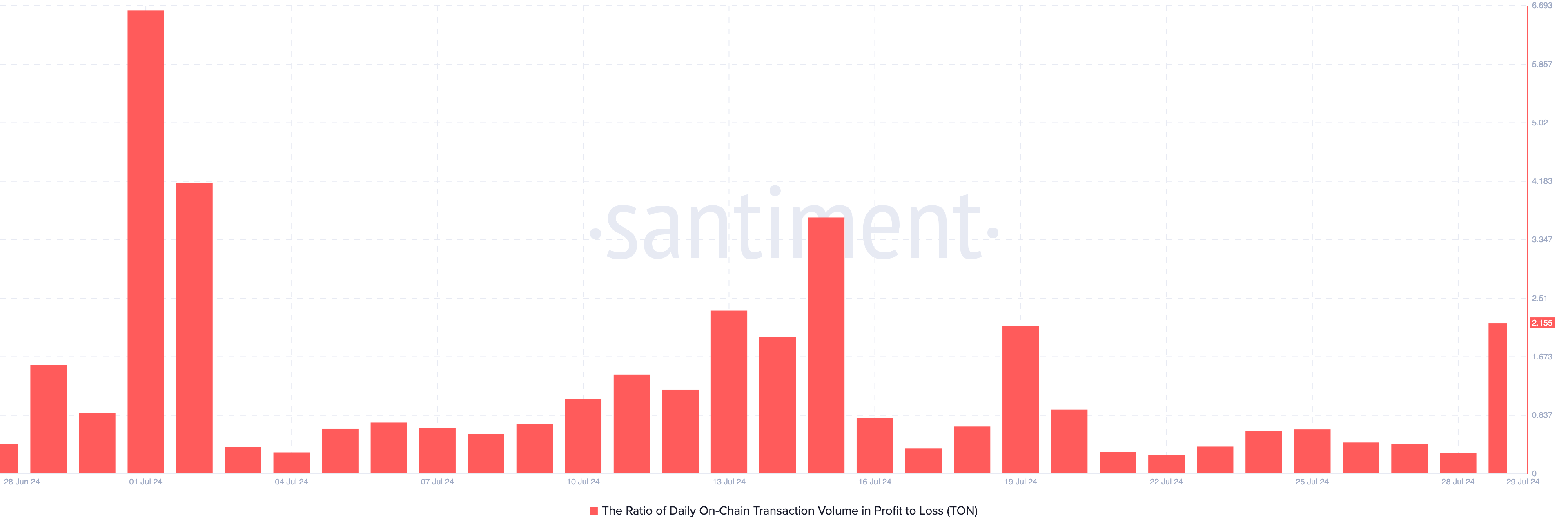 톤의 가격 반등으로 인해 일일 온체인 거래의 손익 비율은 7월 19일 이후 최고치를 기록했습니다. 이 지표는 토큰 보유자가 손실을 실현하고 있는지 또는 이익을 실현하고 있는지를 보여줍니다. 마이너스이면 이익보다 실현된 손실이 더 많다는 뜻입니다.