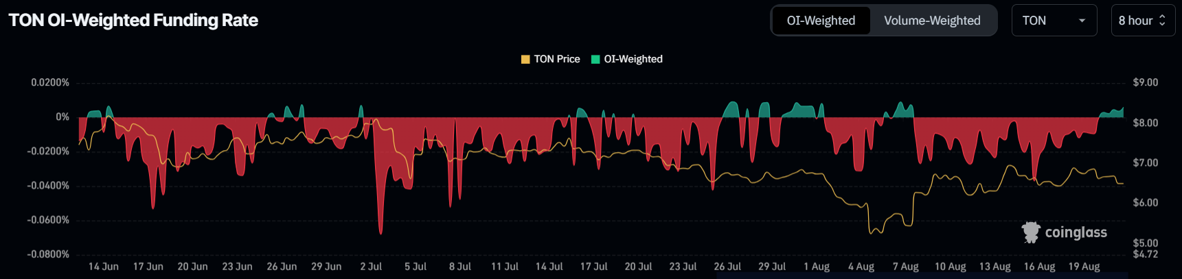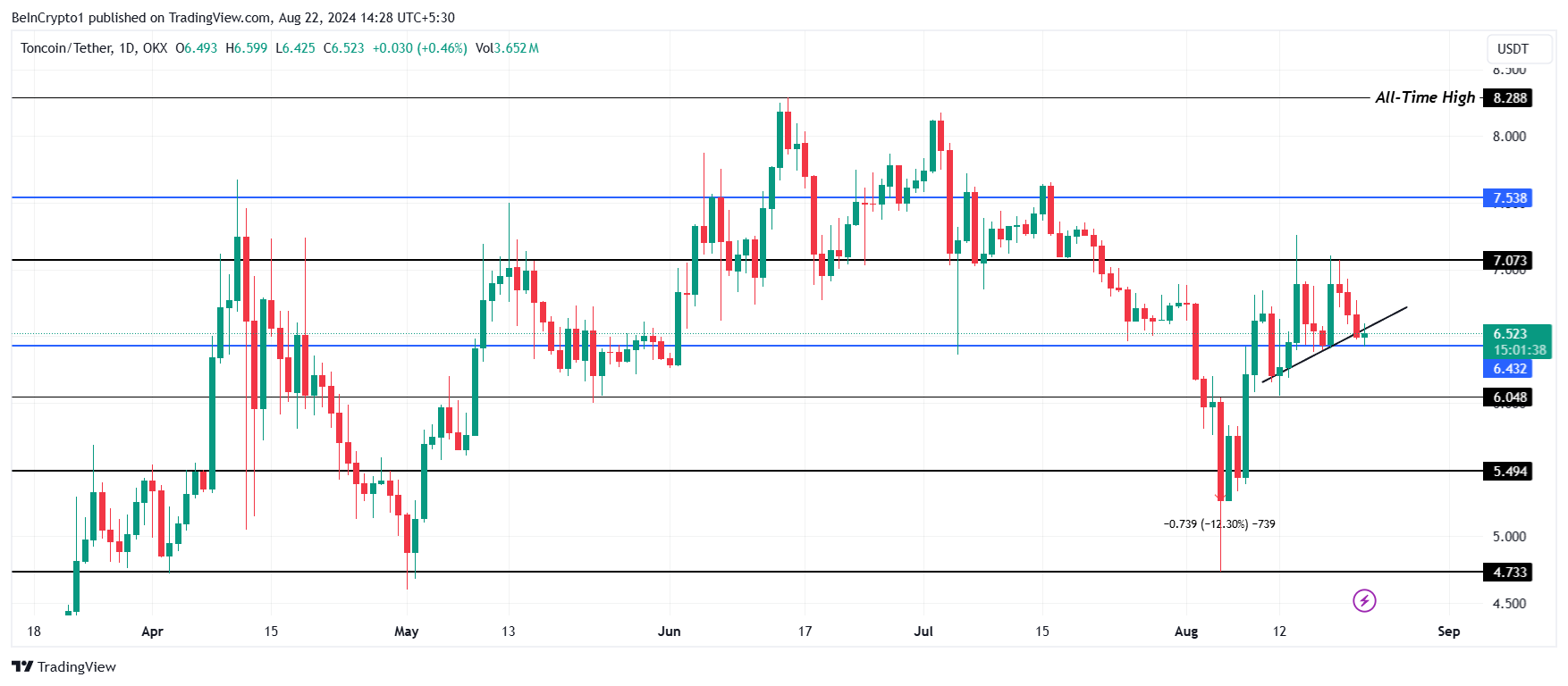 이는 7.53달러까지 상승을 가능하게 할 것이며, 이는 7월 중순 이후로 테스트되지 않은 수준입니다. 이를 지지선으로 전환하면 톤코인이 상승을 계속하고 8.28달러의 사상 최고가를 돌파할 수 있습니다.