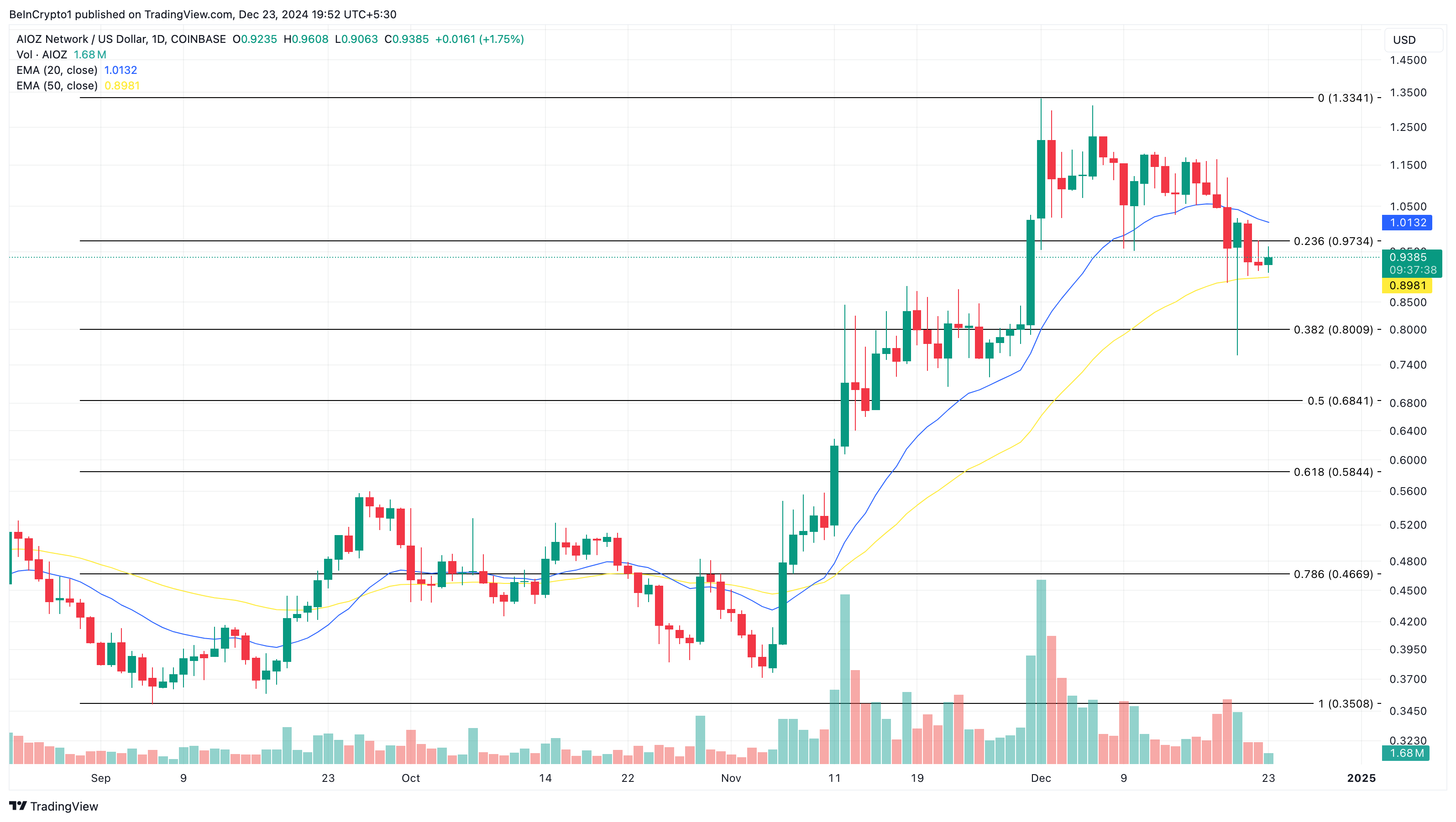 올해 최고의 성과를 보인 암호화폐 중 하나임에도 불구하고, 일일 차트는 AIOZ가 파란색의 20기간 지수 이동 평균(EMA) 아래로 떨어졌으며, 노란색의 50 EMA 아래로 미끄러질 위기에 처해 있음을 보여줍니다.