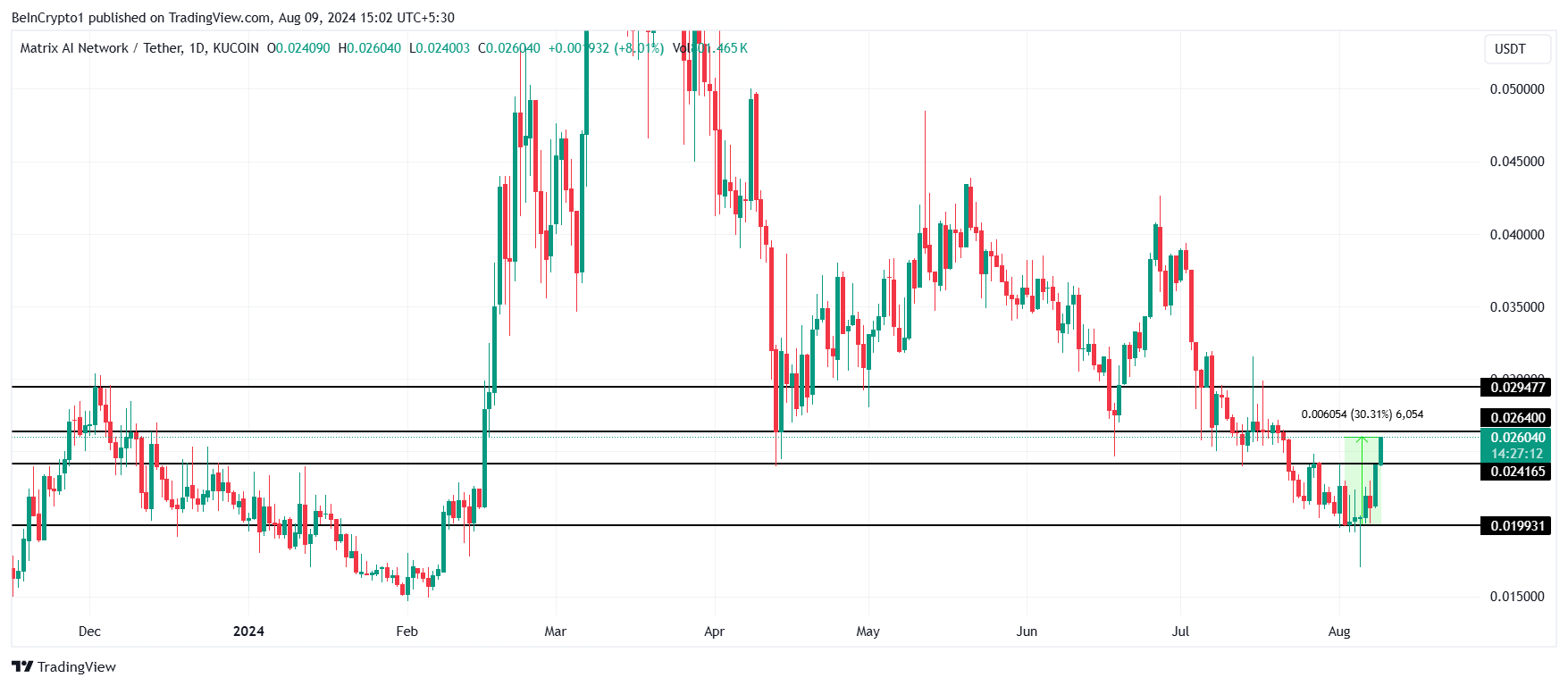 MAN은 지난 한 주 동안 30% 이상 상승하며 토큰과 거의 비슷한 성장세를 보였습니다. 매트릭스 AI 네트워크는 현재 0.026달러선을 저항 삼아 횡보 중이며, 이는 과거에 중요한 지지선으로 작용했던 수준입니다.