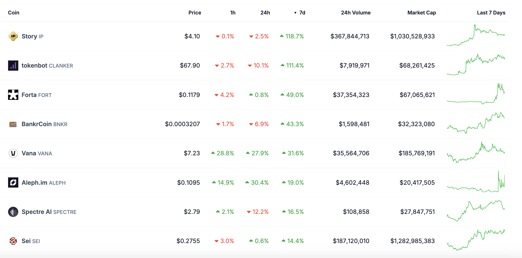 스토리(IP)는 두드러진 성과를 보이고 있습니다. 지난주에 약 120% 상승했습니다. 이는 가장 인기 있는 알트코인 중 하나가 되었고, 빠르게 10억 달러의 시가총액에 도달했습니다. 마찬가지로, 베이스의 가장 큰 코인 런치패드 중 하나인 클랭커는 111% 상승하여 2025년 1월 초 이후 최고 가격 수준에 도달했습니다.