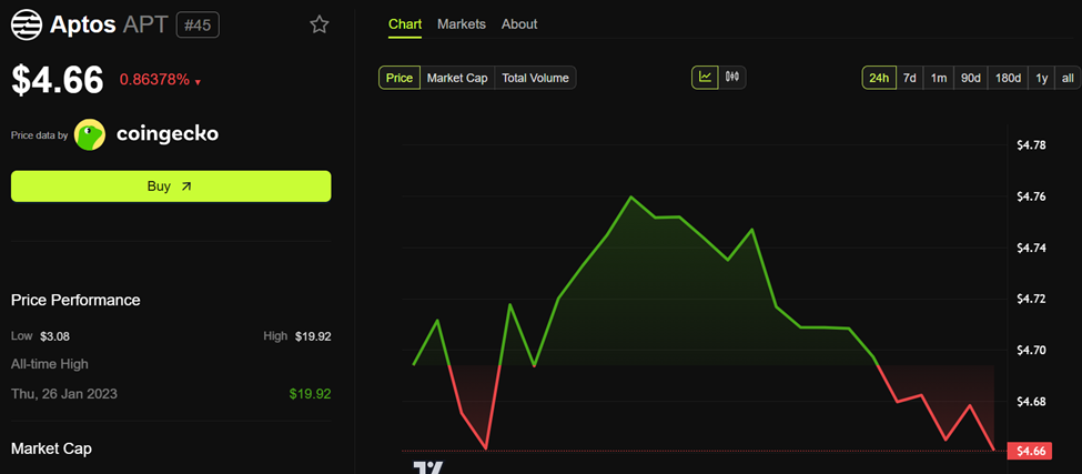 BeInCrypto 데이터에 따르면 앱토스의 주력 토큰 APT는 현재 4.66달러에 거래되고 있으며, 지난 24시간 동안 거의 1% 하락했습니다.