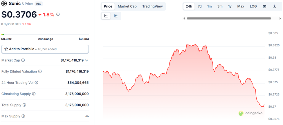 소닉의 S 토큰은 현재 0.3706달러에 거래되고 있으며, 지난 24시간 동안 약 2% 하락했습니다.