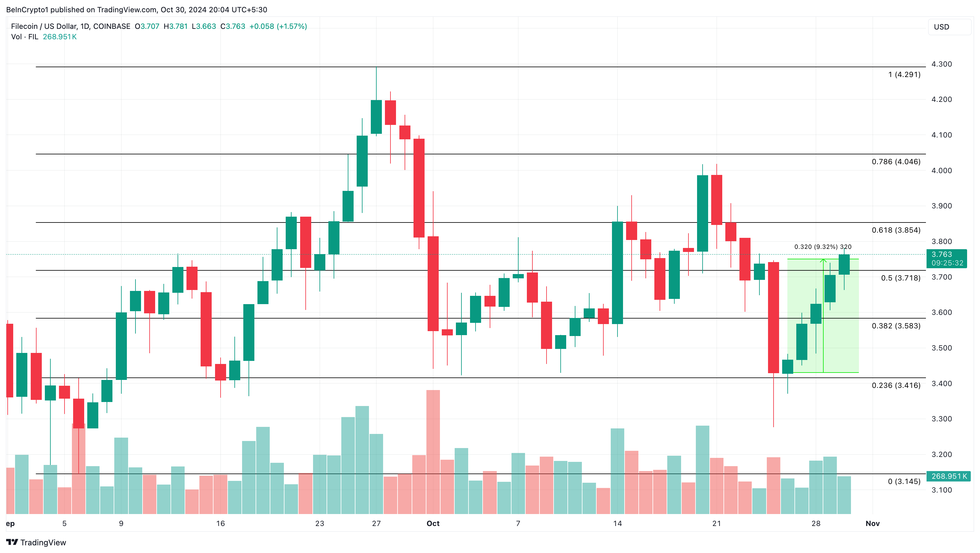 2024년 11월에 주목해야 할 또 다른 DePIN 분야의 알트코인은 분산형 저장 시스템의 네이티브 토큰인 Filecoin입니다. FIL은 지난 30일 동안 3달러와 4달러 사이에서 거래되었습니다.