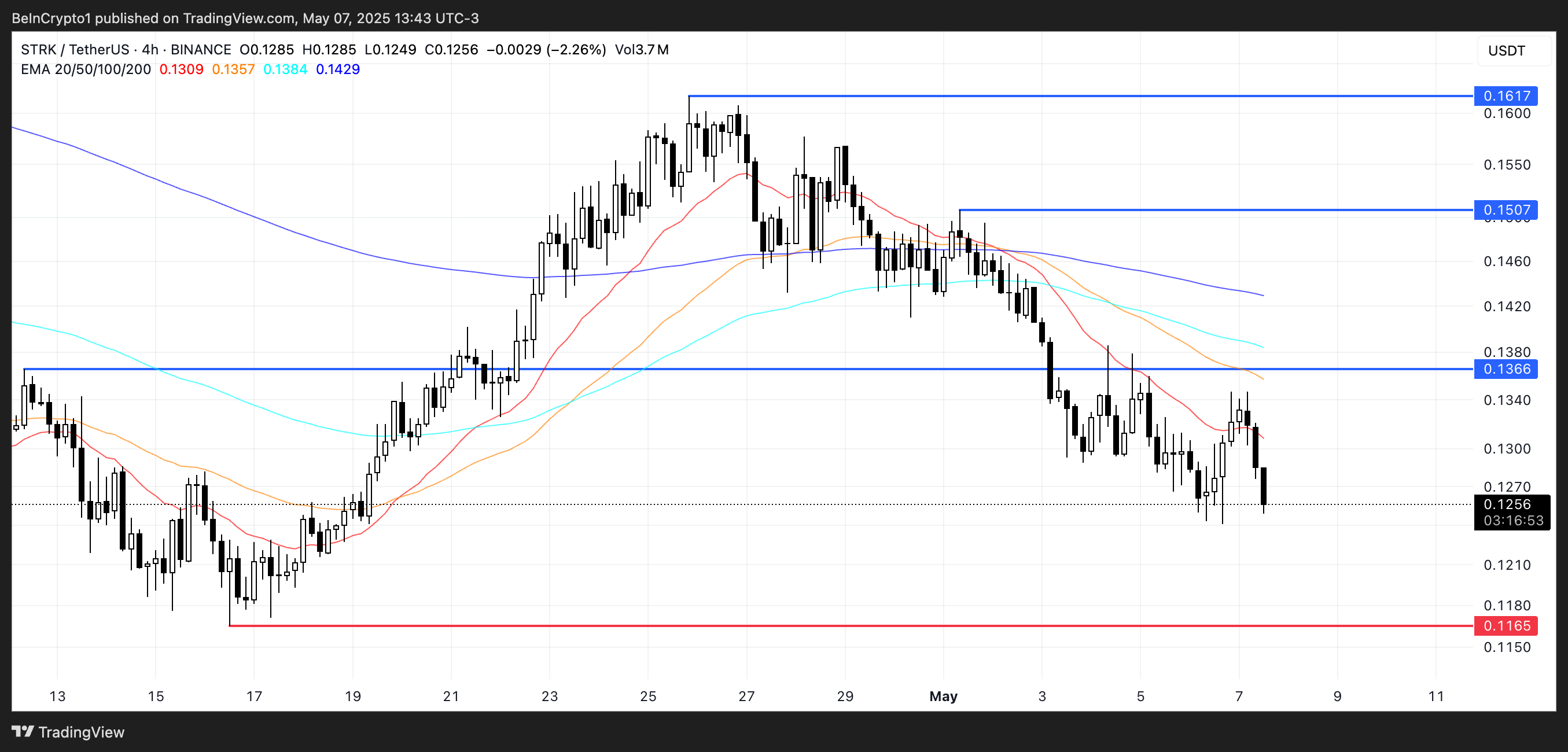 STRK는 지난 7일 동안 13.5% 이상 하락했으며, EMA 라인은 하락세를 나타냅니다. 이 추세가 계속되면 다음 주요 지지 수준은 약 0.116 달러입니다.